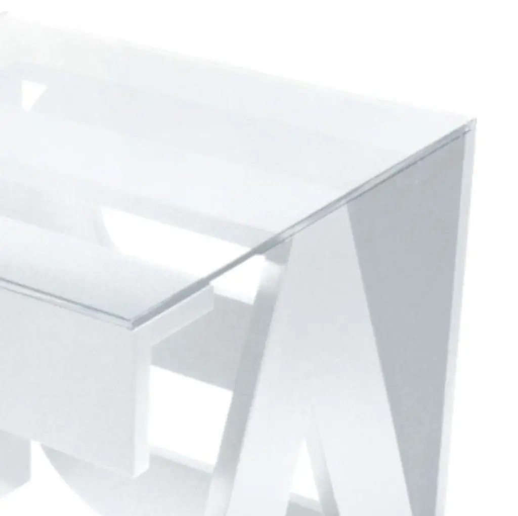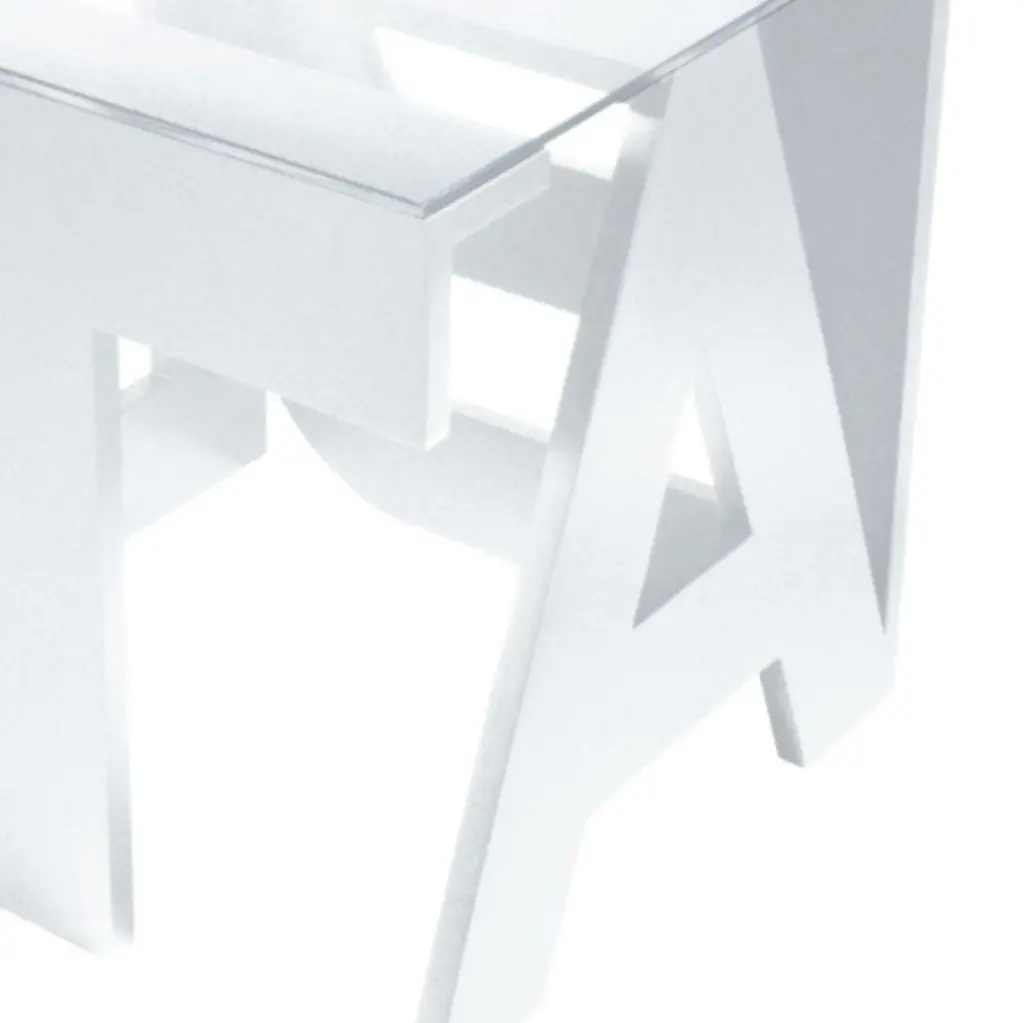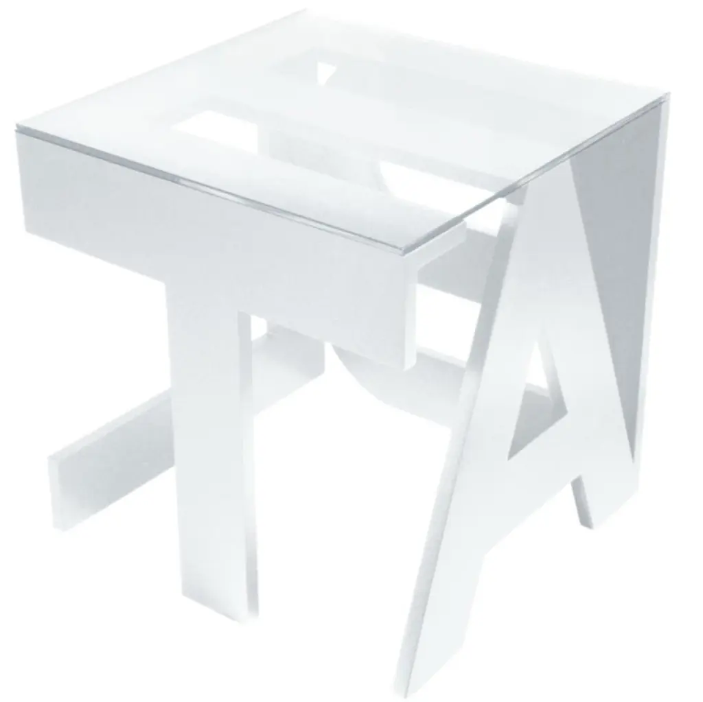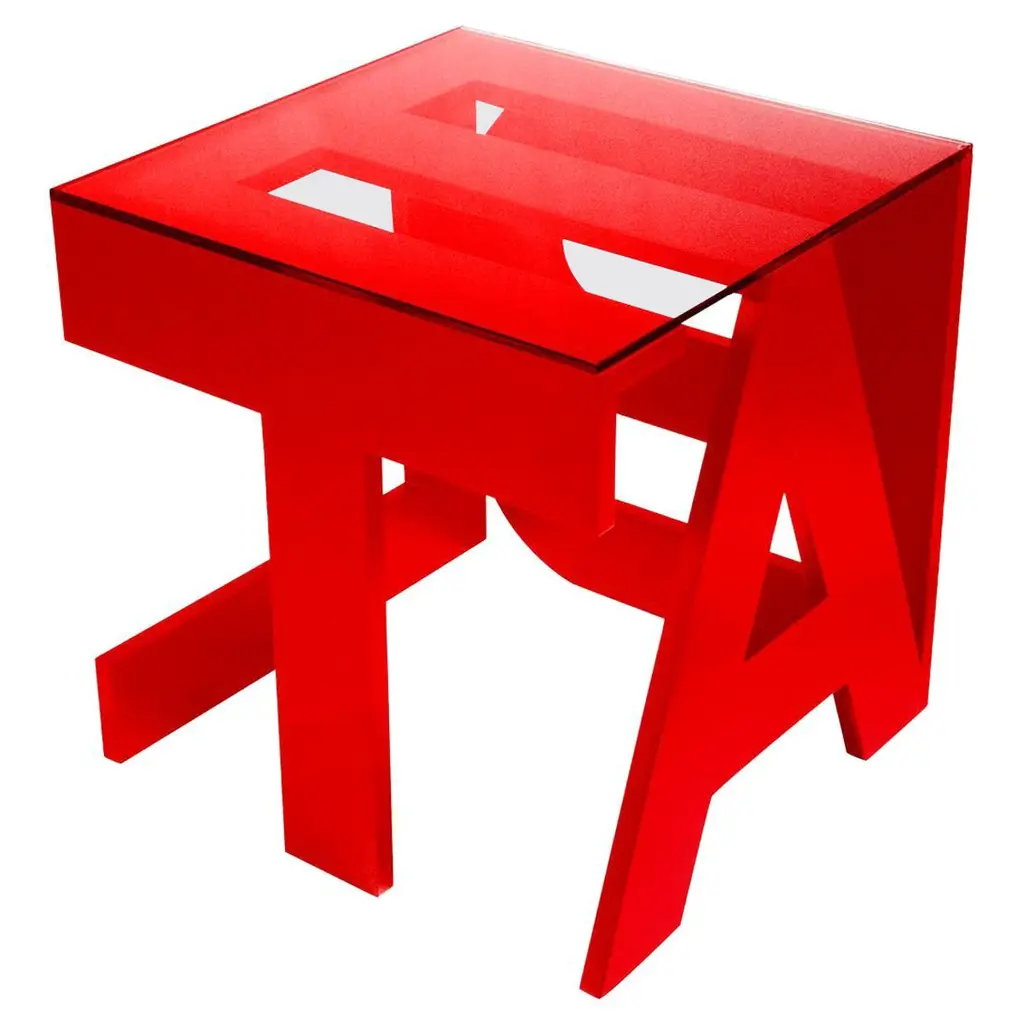 Table table by Roberta RampazzoCurrent ProductionDimensions: W 50 x D 50 x H 52 cmMaterials: MDF 20mm, Glass.With the letters of the word "table", the designer created a funny table with an unique design which brings innovation and modernity to the space. This means that the user can play with the table. Made with certified MDF. Final painting is with lacquer in different colors making it possible to decorate in accordance with personal styles.With more than 20 years on the market, Roberta has her own line of furniture as well as for high end stores such as Firma Casa, Mosarte, Objekto (France), Vermeil and others.Her work has been published in the most important design magazines and websites in more than 30 countries like England, The United States, France, Germany, Italy, Denmark and Japan. Also being recognised in important design awards including A Design Award and German Design Award Nominee. Her pieces are currently being sold in high end shops in Brazil, France, England, Australia, Spain and others countries. Currently living in London the designer is continuing her creative work with new products and companies.