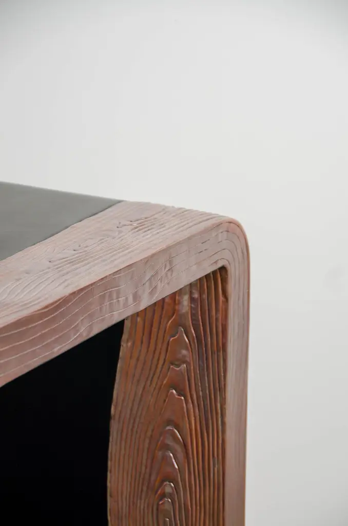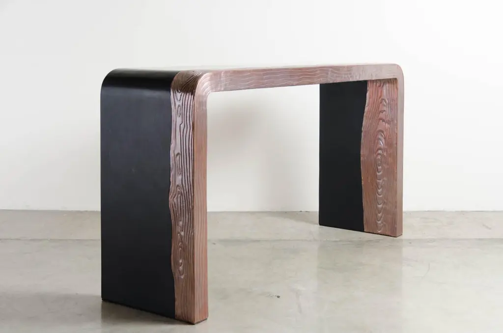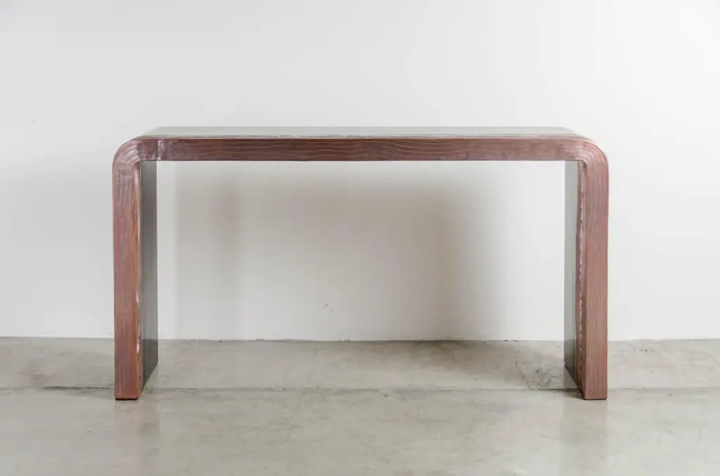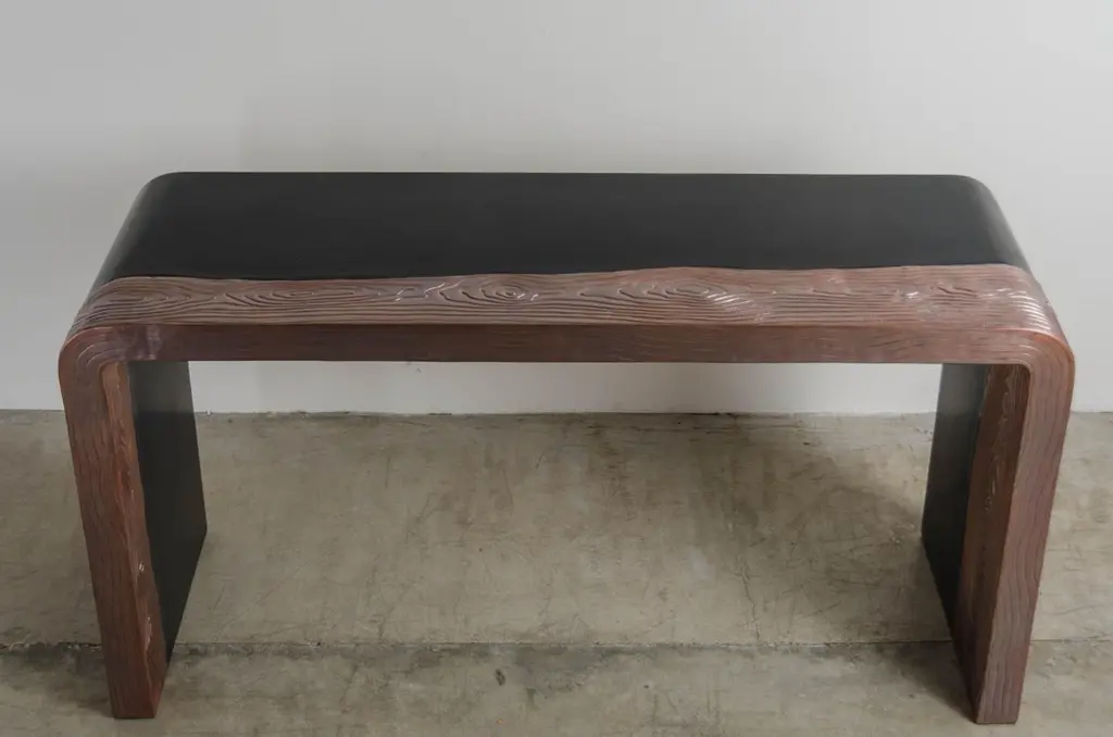 Woodgrain design consoleBlack lacquerAntique copperHand RepousseLimited editionEach piece is individually crafted and is unique.Lacquer is a technique that dates back to the Shang dynasty, circa 1600-1100 B.C. These pieces are made with at least 60 coats of organic lacquer. Each layer of lacquer is applied with a curing period of 24 hours in between so that it can dry.