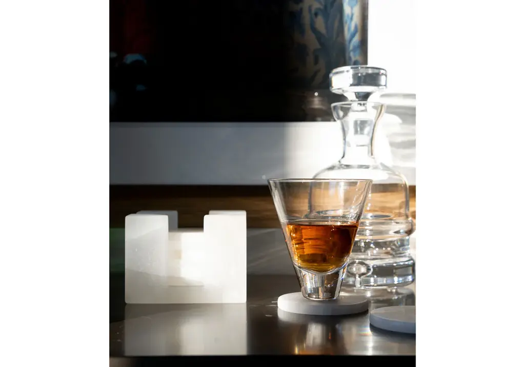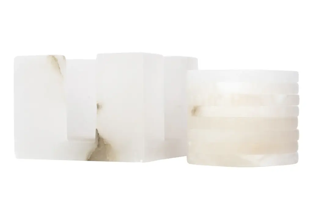 Final Sale Incredibly tasteful, this alabaster set is a must-have. Its beautiful, natural coloring and veining are showcased on eight individual coasters paired with a matching holder. Style on a coffee table, console, or counter for an elevated, functional design.