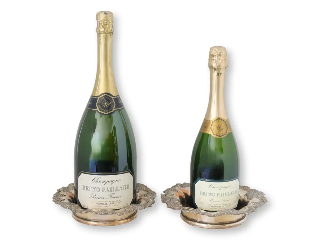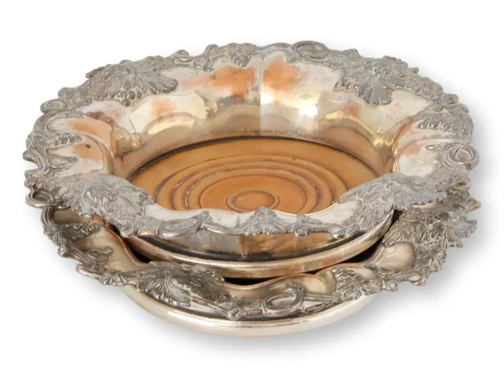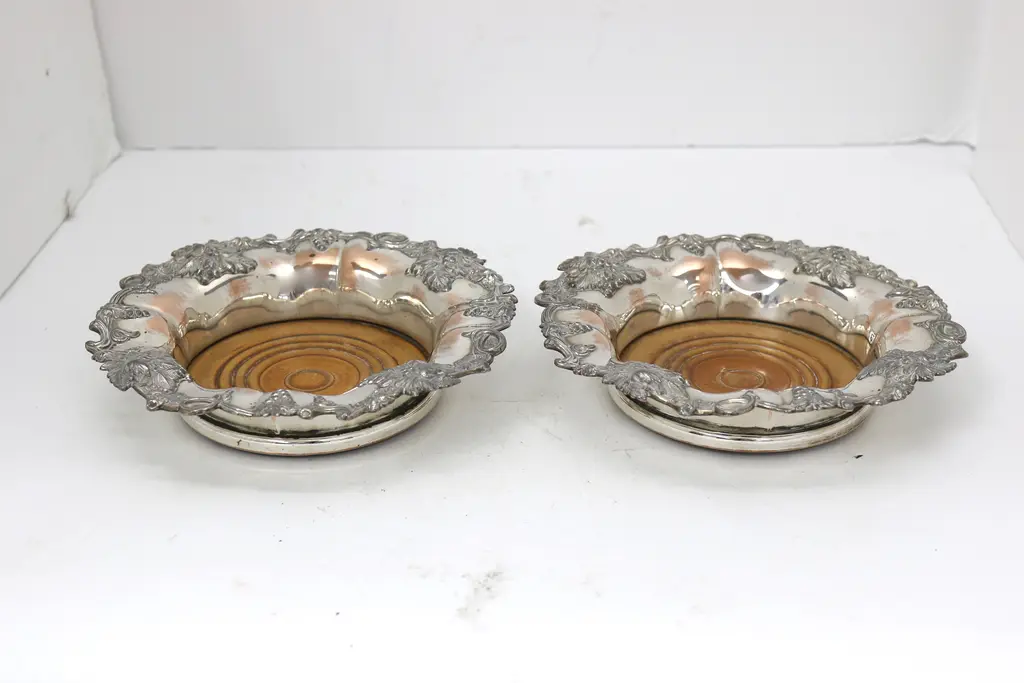 Pair of antique English silver-plate wine coasters with wooden bottom. Polished down to the copper, typical of the early Sheffield silverplate over copper. Made during the Georgian period in England, circa 1820. No maker's mark.
