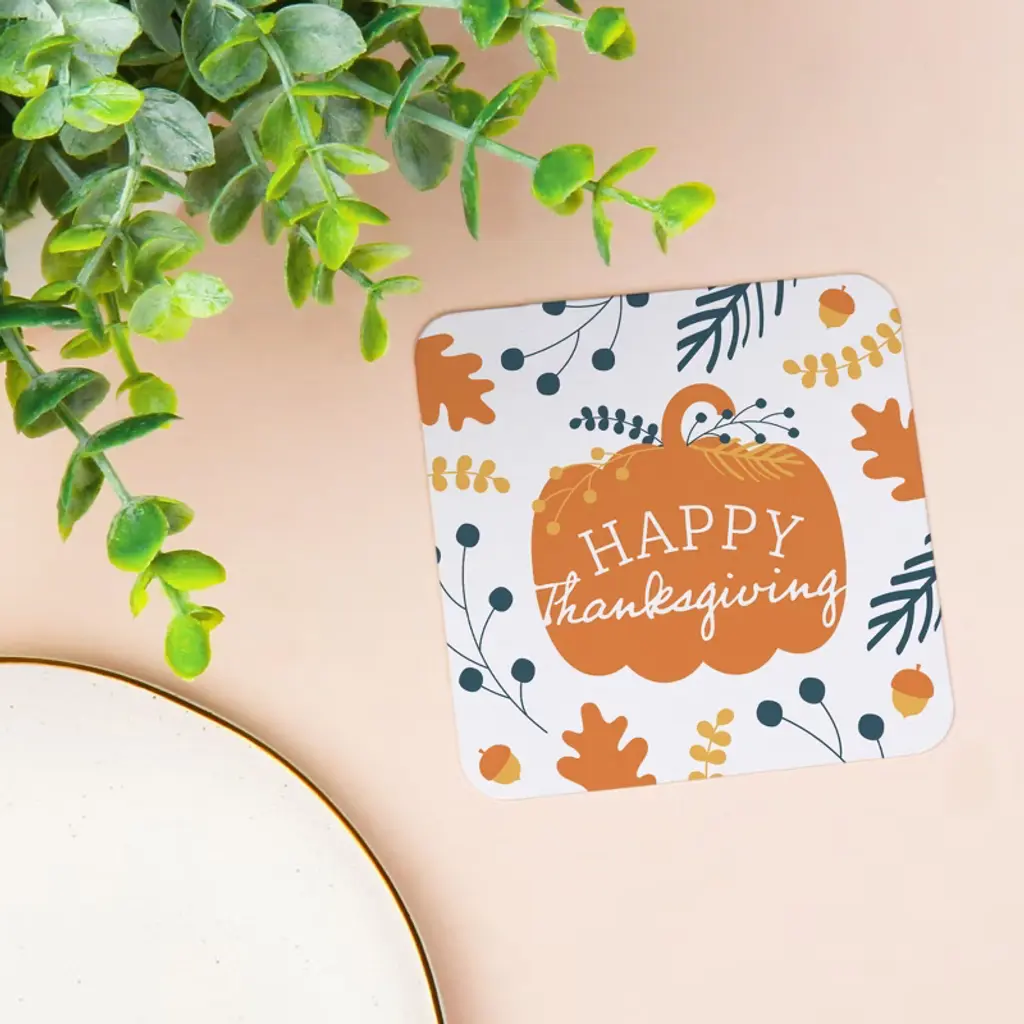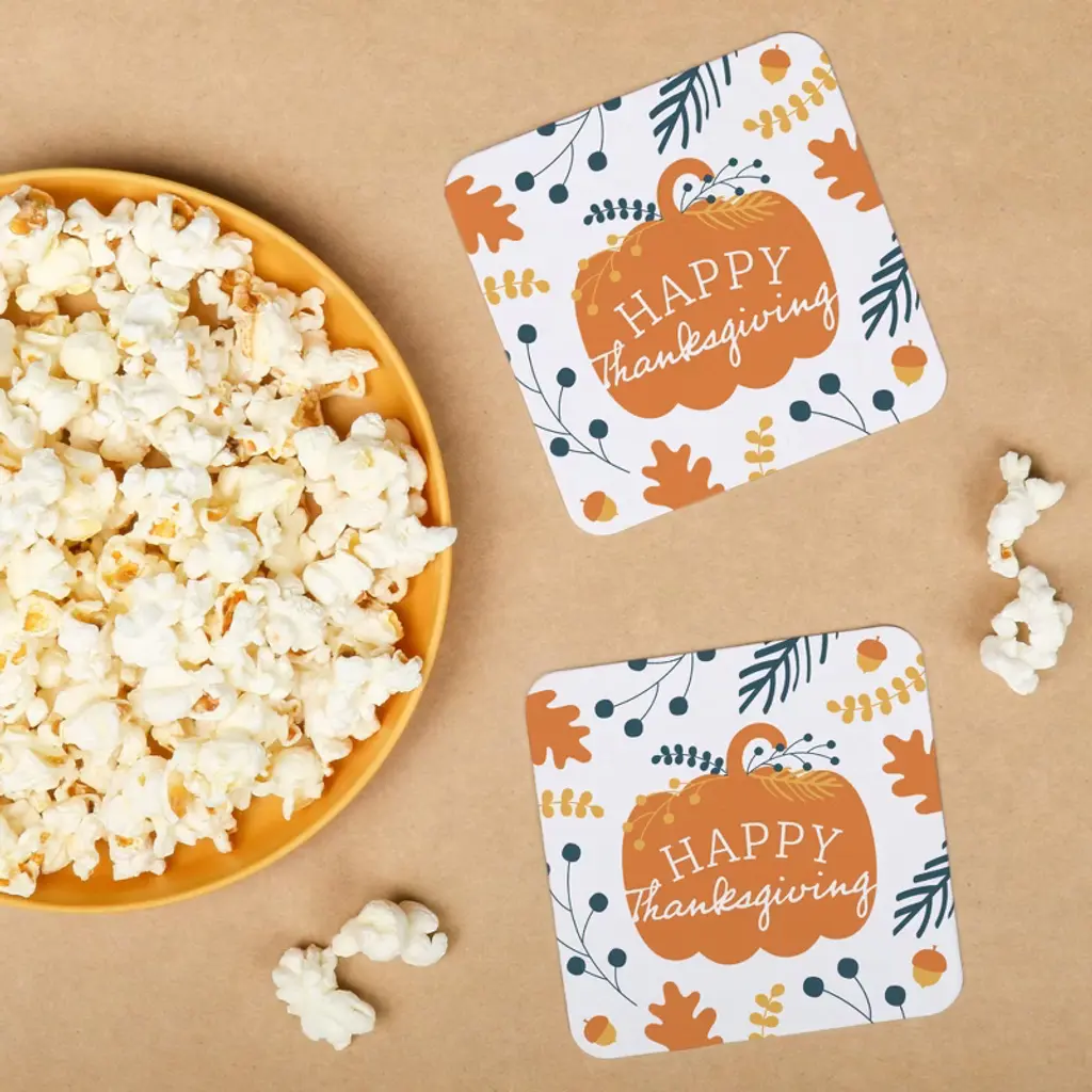 Disposable Drink Coasters for Thanksgiving: This set of 25 square white pulpboard coasters is the perfect blend of fun and function! Each 4-inch drink coaster adds personality to your Happy Thanksgiving party table while helping protect surfaces from spills and water rings. Designed for single-use, they’re great for gatherings big and small. Disposable Coasters for Fall Parties: Whether you’re serving pumpkin spice cocktails or cider, these stylish coasters bring festive flair to your drink station. Great for game day snacking, watching football, or sipping wine while waiting on the turkey. Coaster Gift Ideas: From Friendsgiving to fall dinner parties, these coasters make a fun and functional hostess gift! Pair with a bottle of wine or apple cider for an easy gift that’s ready to impress. Quality Disposable Coasters: Each Happy Thanksgiving coaster is professionally printed on one side and made from medium-thick 60 pt. white pulpboard. Lightweight yet absorbent, they’re a great disposable option for beer coasters, coffee bars, or cocktail hour. Square shape fits most cups and glasses with ease. Made in the USA: Our Happy Thanksgiving Party Drink Coasters are designed and manufactured at our Wisconsin facility using paper that is proudly Made in the USA. WARNING: Prop 65 -- This product contains chemicals known to the State of California to cause cancer, and birth defects or other reproductive harm. For more information, go to www.p65warnings.ca.gov.