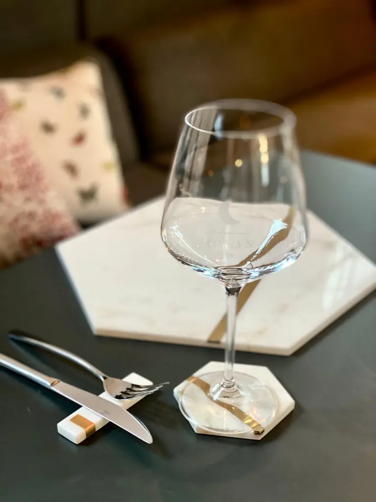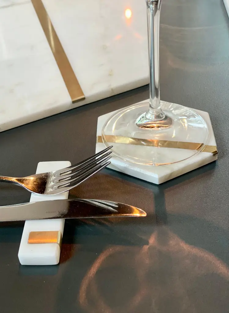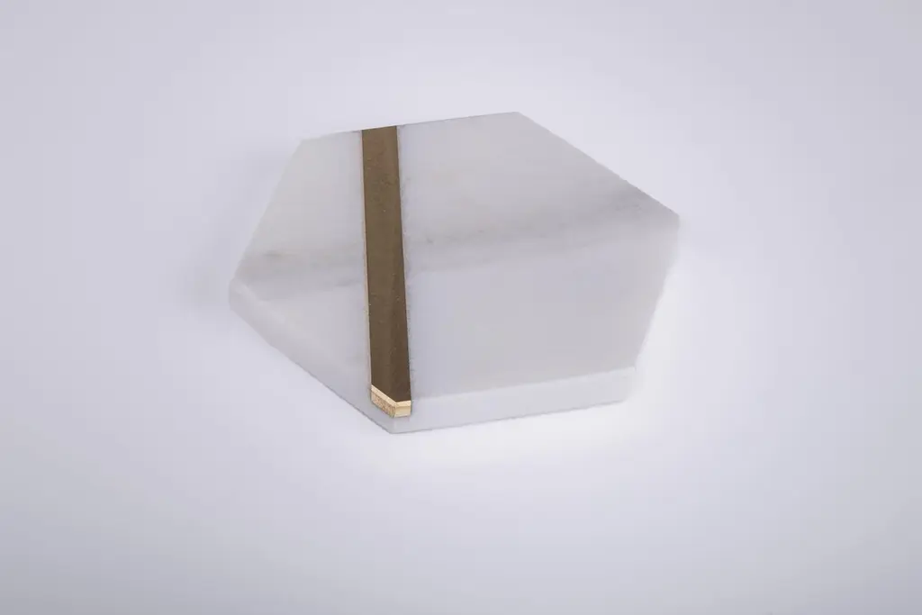 The Brass coasters, entirely made of Calacatta Oro marble, are exclusive coasters embellished with a brass tab that runs along the object from one end to the other, giving it a further touch of refined style.The Brass coasters are part of the new "Brass" Tablewear & Desk Accessories collection, created through the reuse of different types of natural stones. Through these objects we want to offer our customers objects of sustainable design, to give a touch of elegance and refinement to their dining room or office.Entirely made with residual materials from other projects, the Brass collection, created in collaboration with the designer Cristina Romanello, is made up of exclusive trays, placemats, cutting boards, cutlery trays, coasters, place cards and pen holders designed to give more class and elegance to your table or at your office.(Variations in color or slight imperfections are the result of the craftsmanship of this article and are not to be considered defects)
