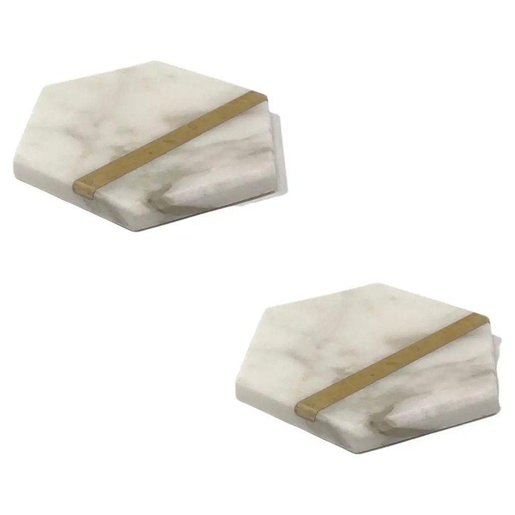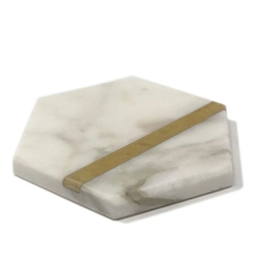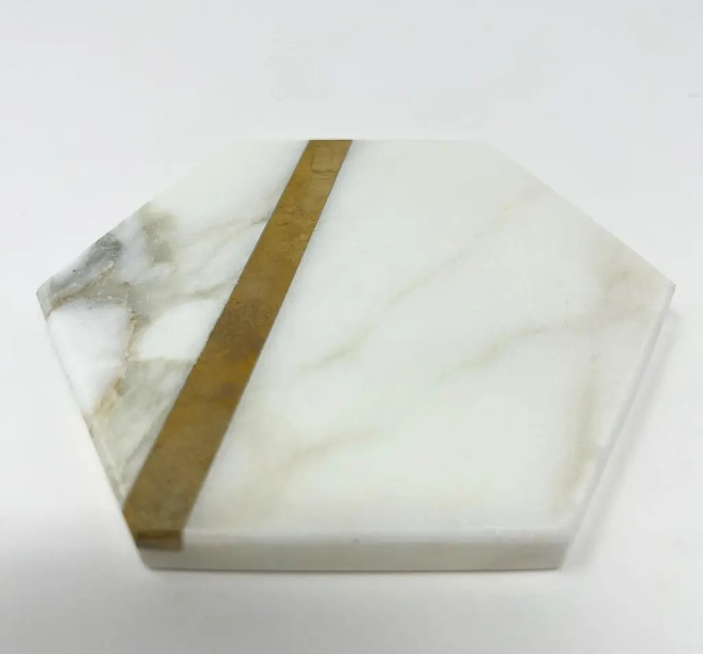 Brass Coaster- 21st Century Calacatta Oro And Brass Hexagonal Coasters Set