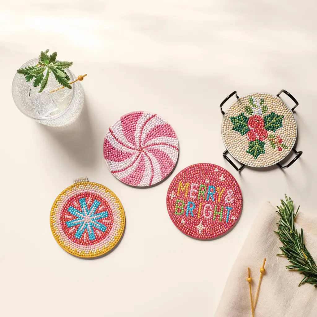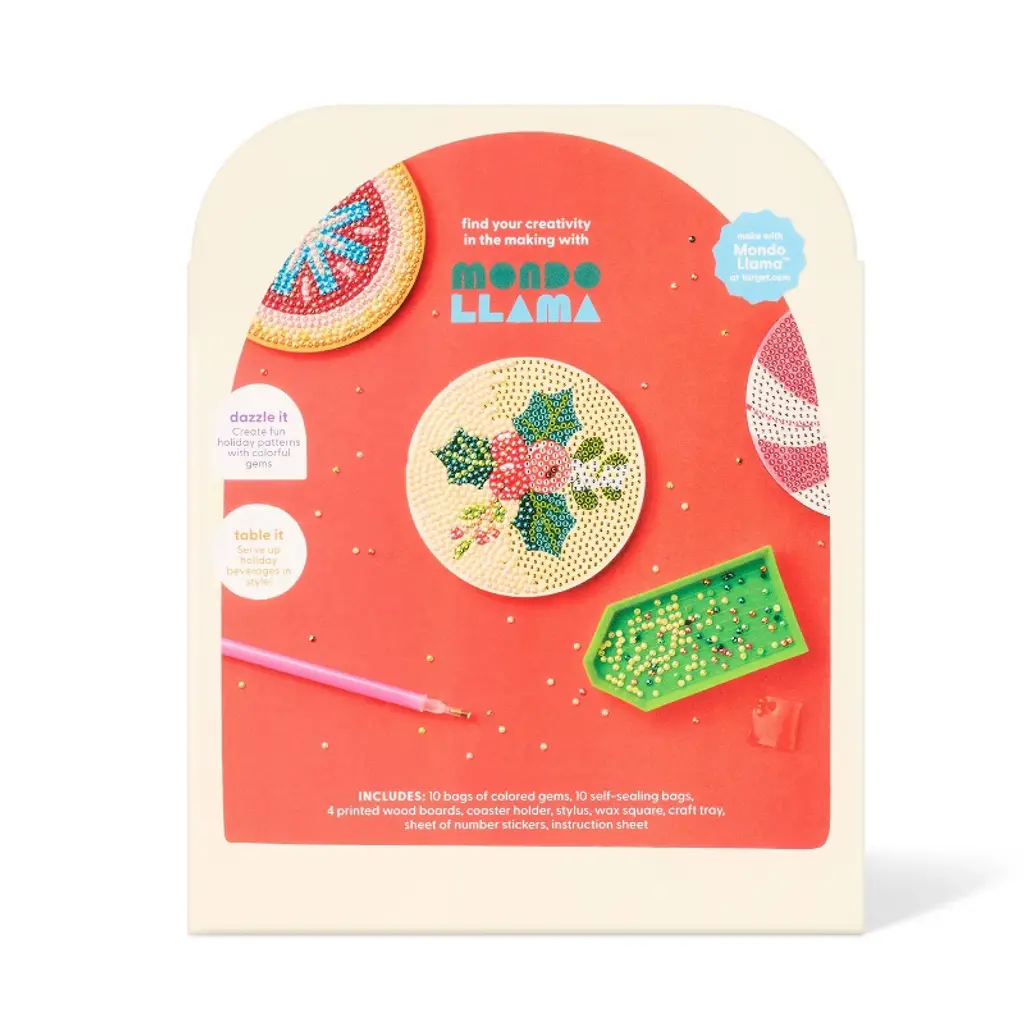 This Christmas Craft 4-Count Gem Art Coasters Kit from Mondo Llama™ combines festive creativity with functional home decor. The DIY kit includes four printed wood coasters along with gem tools, wax, instruction sheet and more to create sparkling holiday-themed coasters. Recommended for ages six and above, this nontoxic kit is perfect for family crafting time while creating personalized coasters that make wonderful gifts or festive additions to your own holiday table setting.Mondo Llama™: Find your creativity in the making.
