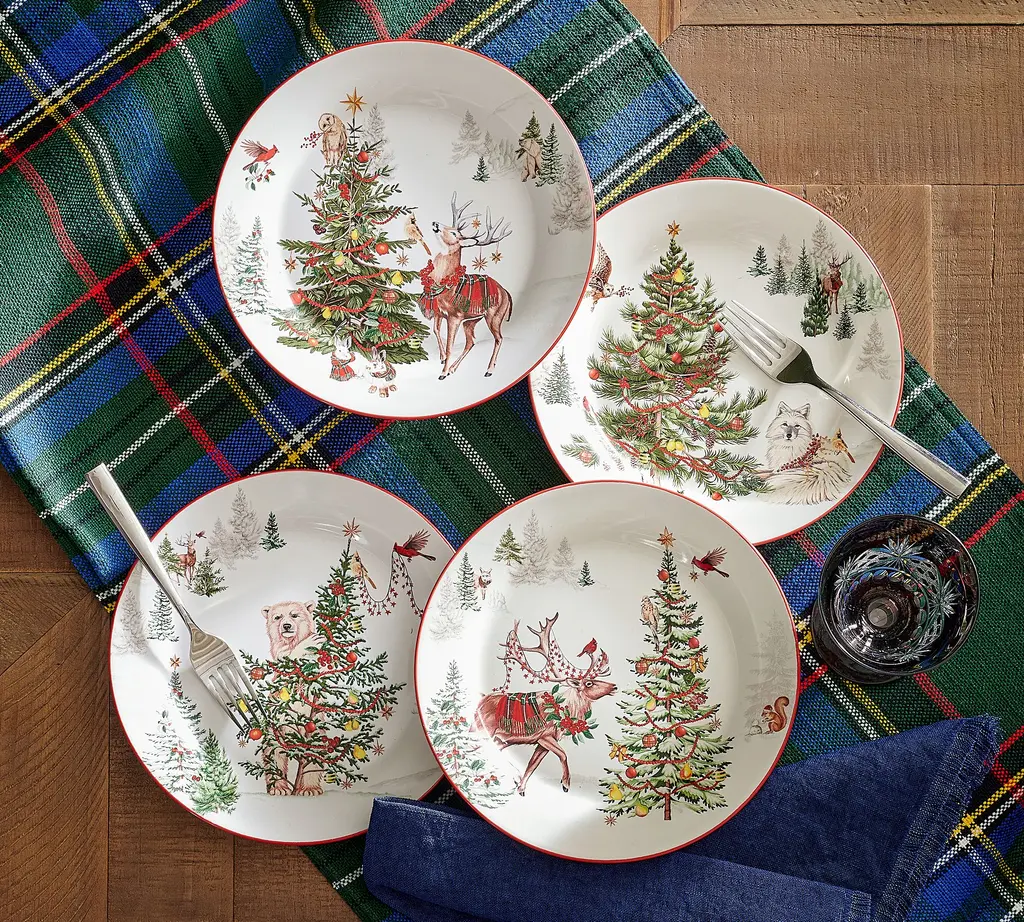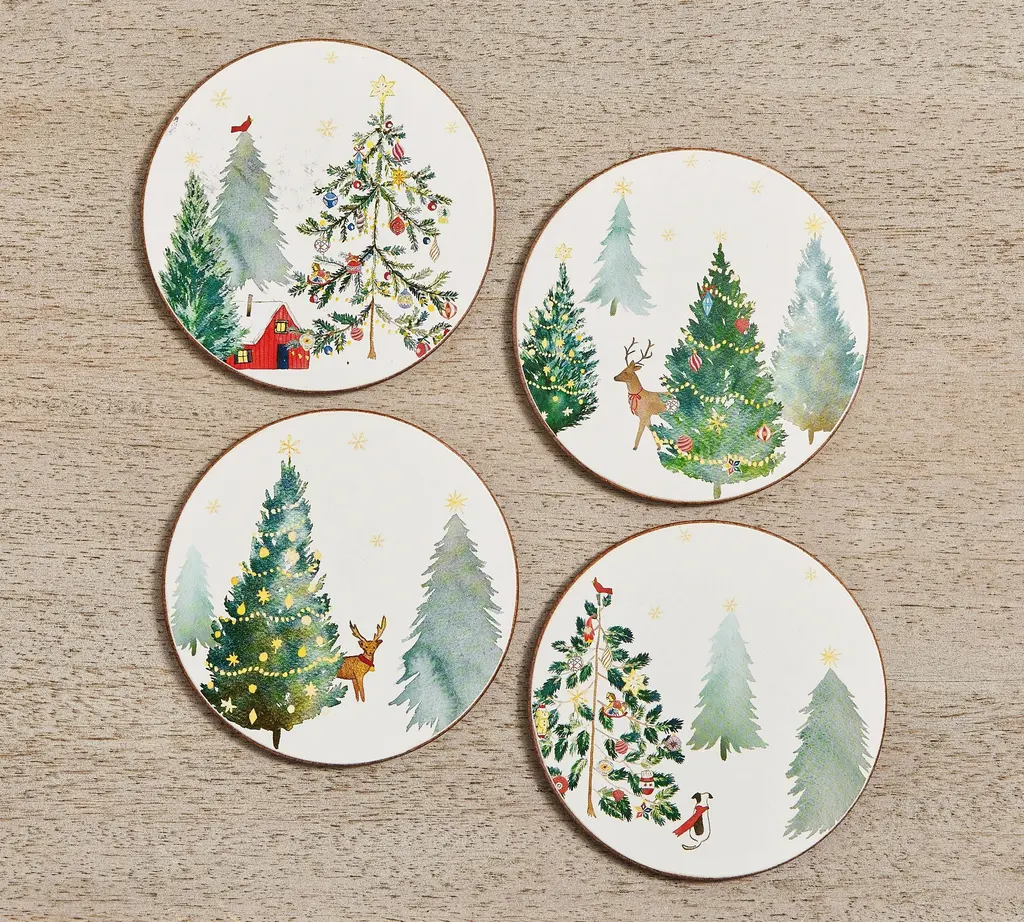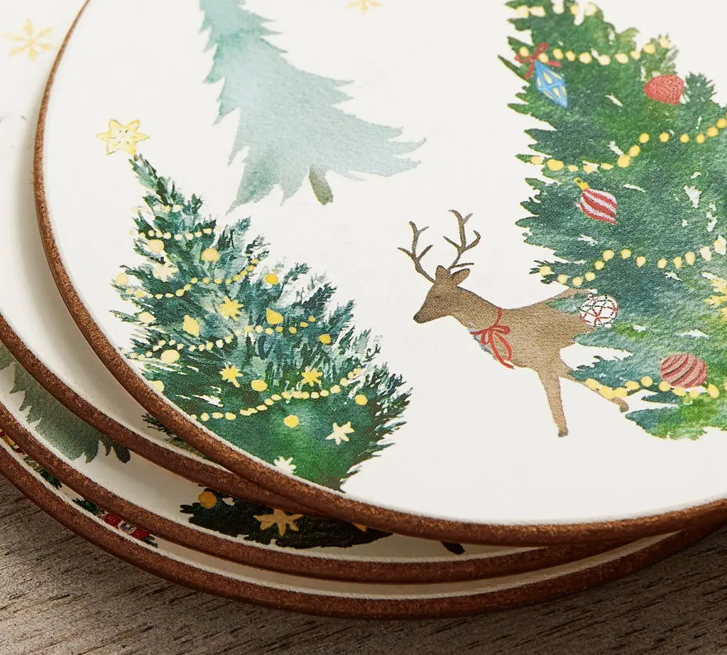 Our love of snow-covered Vermont inspired this glimpse of a countryside ideal. Each coaster in this set of four has a different design (decorated pines, deer, a secluded cottage) in bright reds and washed evergreens. Detailed without being busy, the overall effect has the sweet, subtle nature that will make holiday cocktails and mocktails a country escape. Something that makes us like this set even more: recycled materials were used for sustainability.
