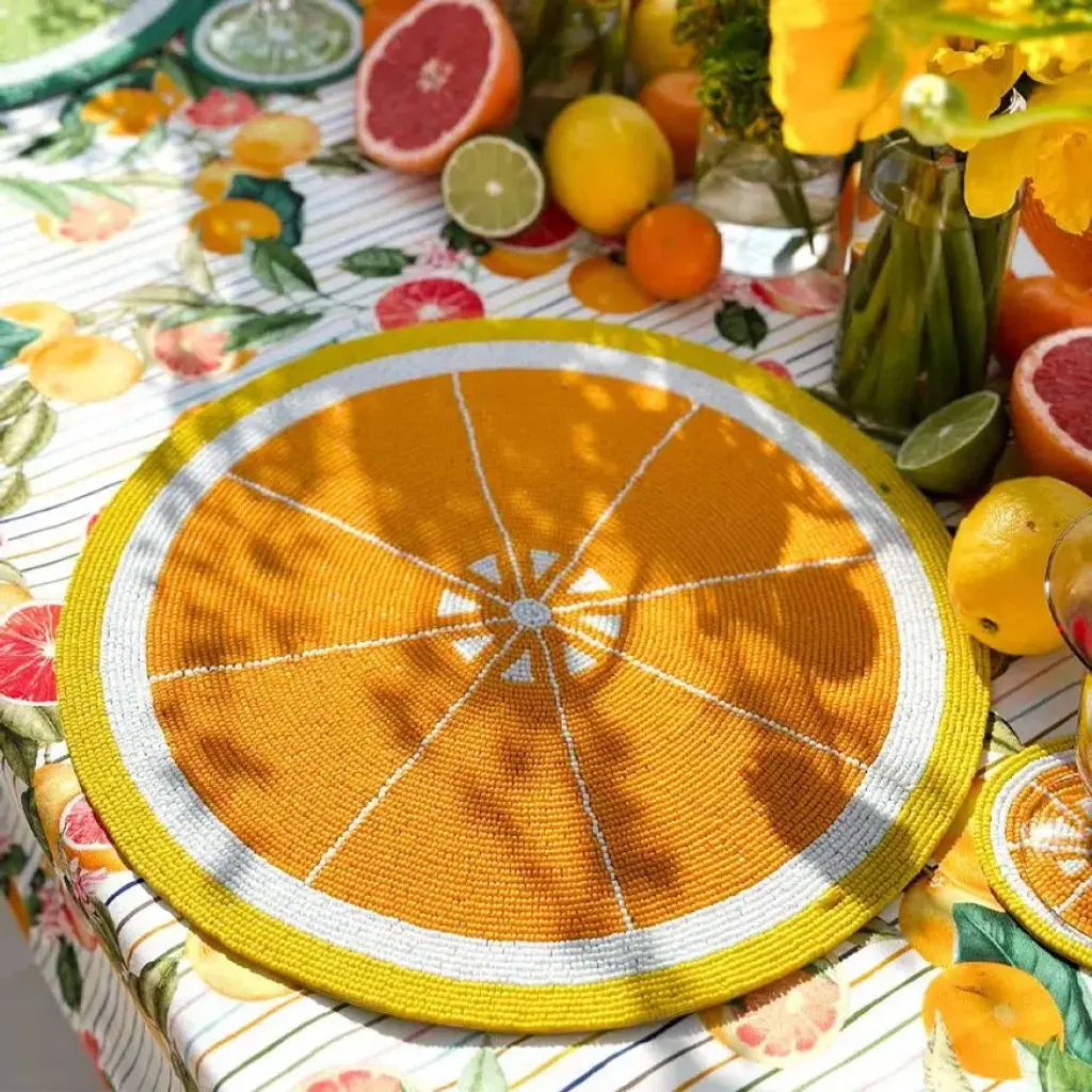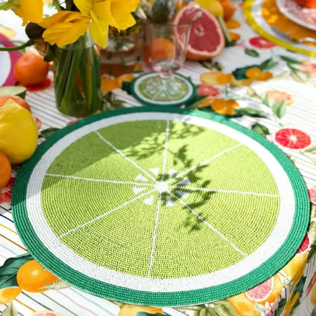 Sweet and zesty. these citrus-inspired coasters will brighten up your table with a fresh fun vibrancy. The Citrus Coasters add striking and vivacious colorful hues to your tablescape, creating a festive yet undeniably modern and chic look. These hand-beaded coasters are sure to delight your guests. Pair with coordinating Orange, Lemon, Grapefruit, or Lime Placemats.