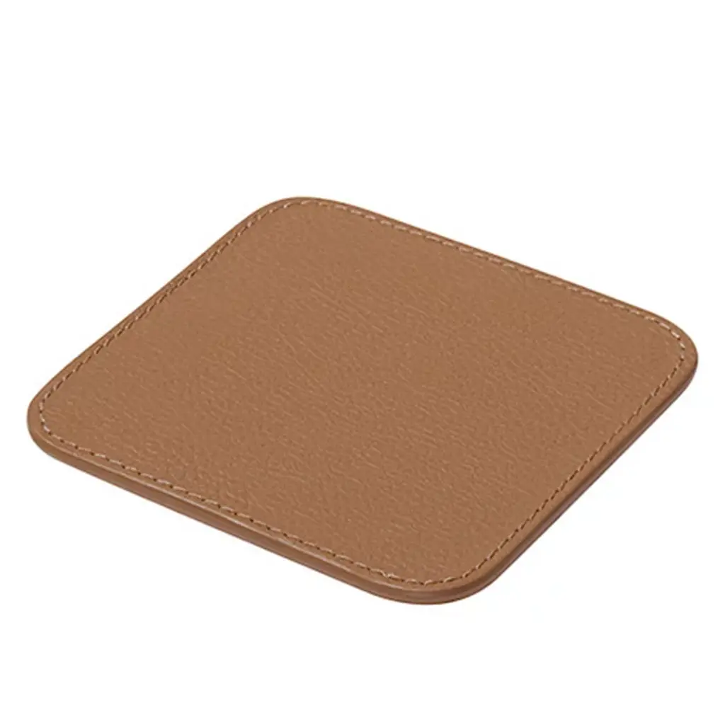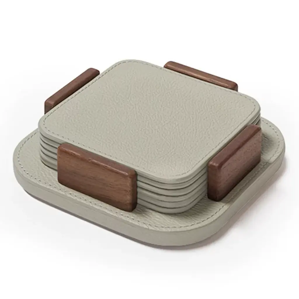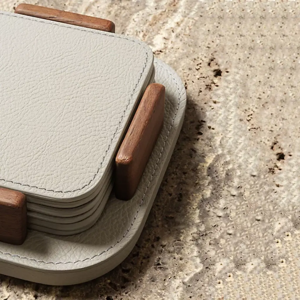 Designed by Giobagnara for Poltrona Frau, the Coaster Holder - Set of 6 features a square base with rounded corners, covered in Pelle Frau® leather. It includes four wooden stops to hold six leather-covered coasters. The coasters protect surfaces from marks or stains and add a touch of color, enhancing the overall table setting.