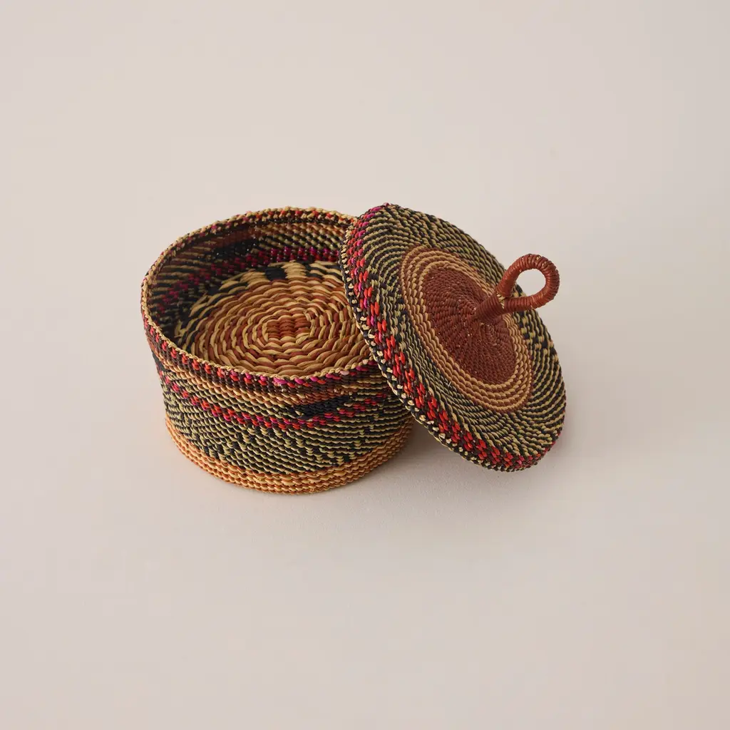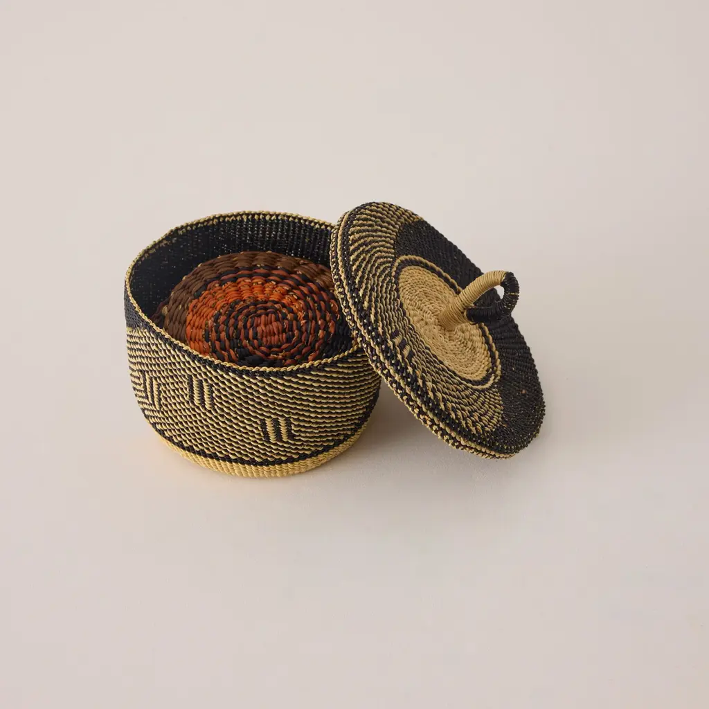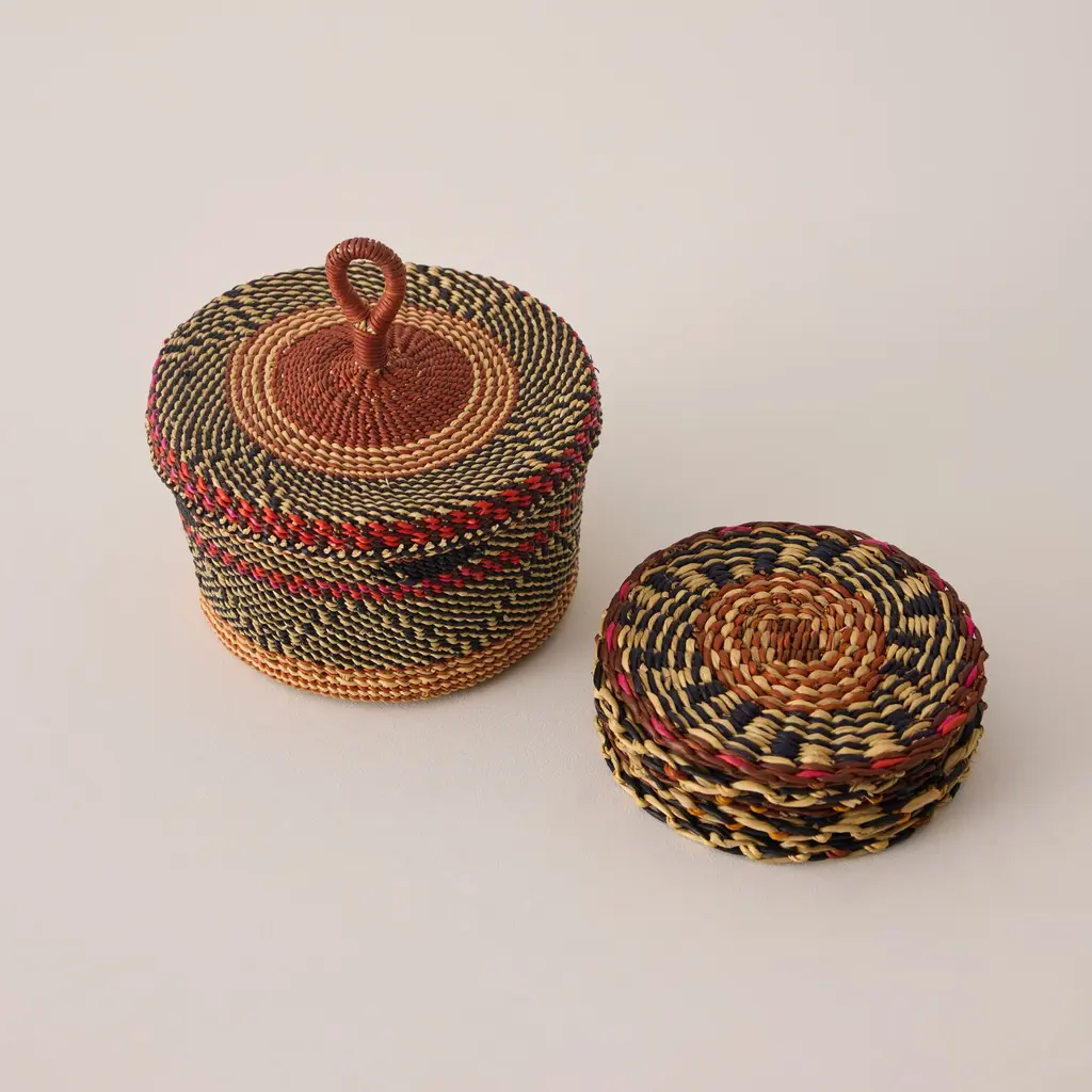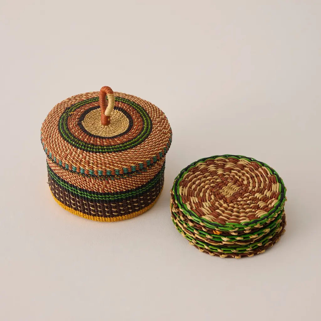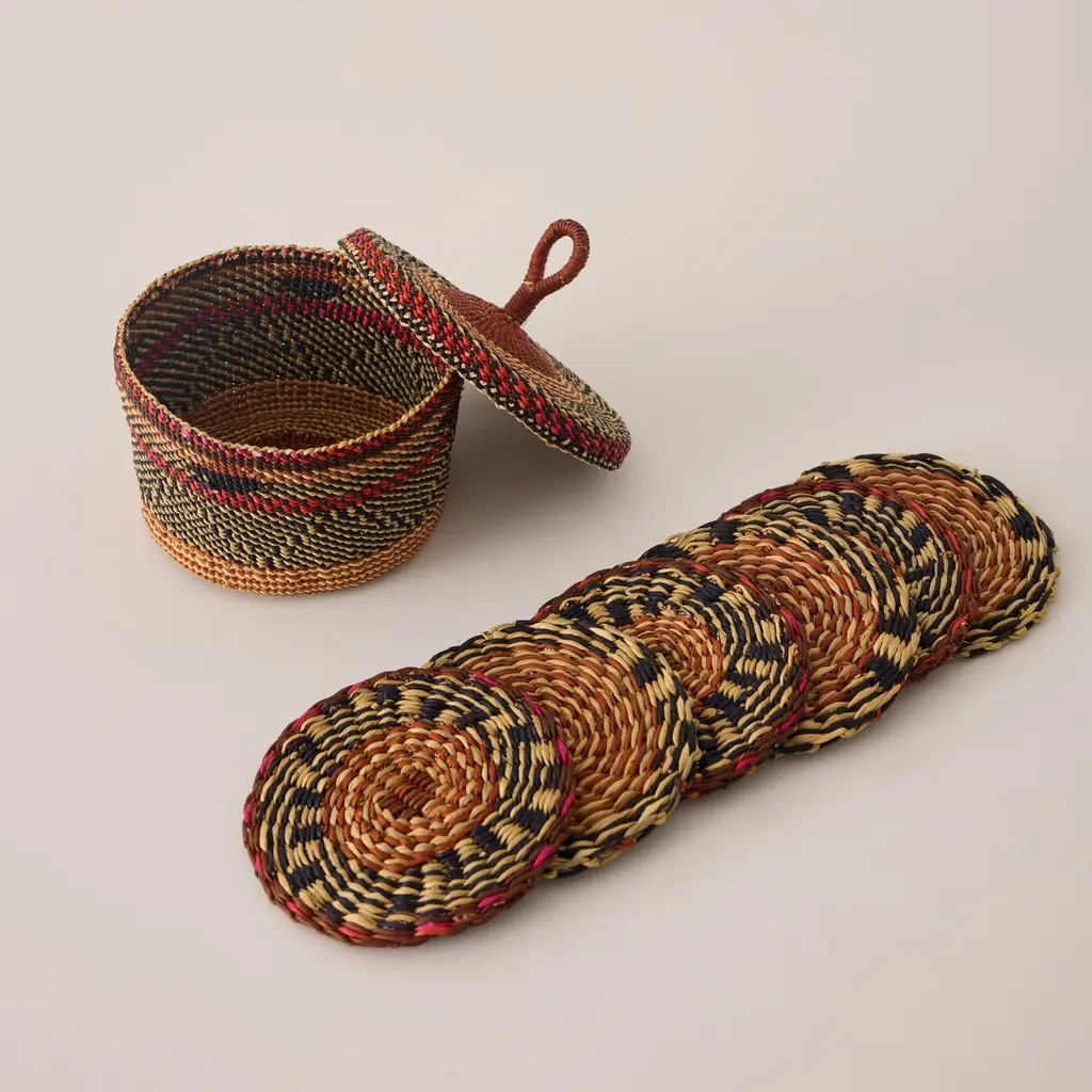 Bring both function and artistry to your table with this exclusive Coasters & Holder - Set of 6 from Baba Tree. Expertly handwoven in Ghana using time-honored techniques and sturdy elephant grass, each coaster combines durability with intricate design, protecting your surfaces in style. The coordinating lidded holder keeps them neatly organized while adding a decorative accent to your home. Every Baba Tree piece is crafted under ethical working conditions, providing meaningful income for its artisans. * This Coasters & Holder - Set of 6 includes 6 coasters and 1 mini basket with lid.