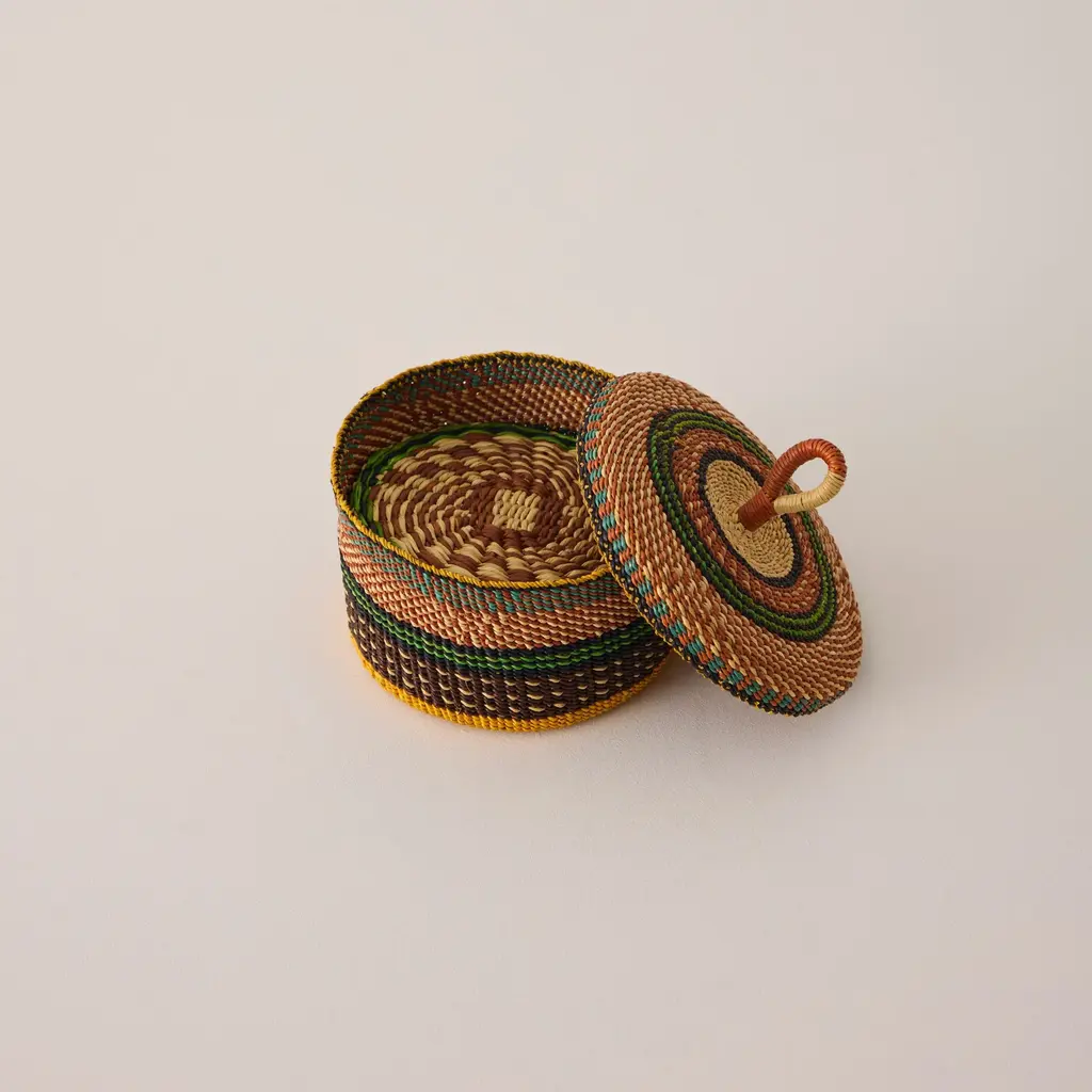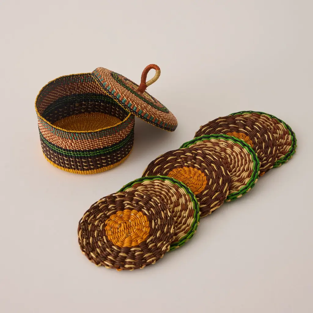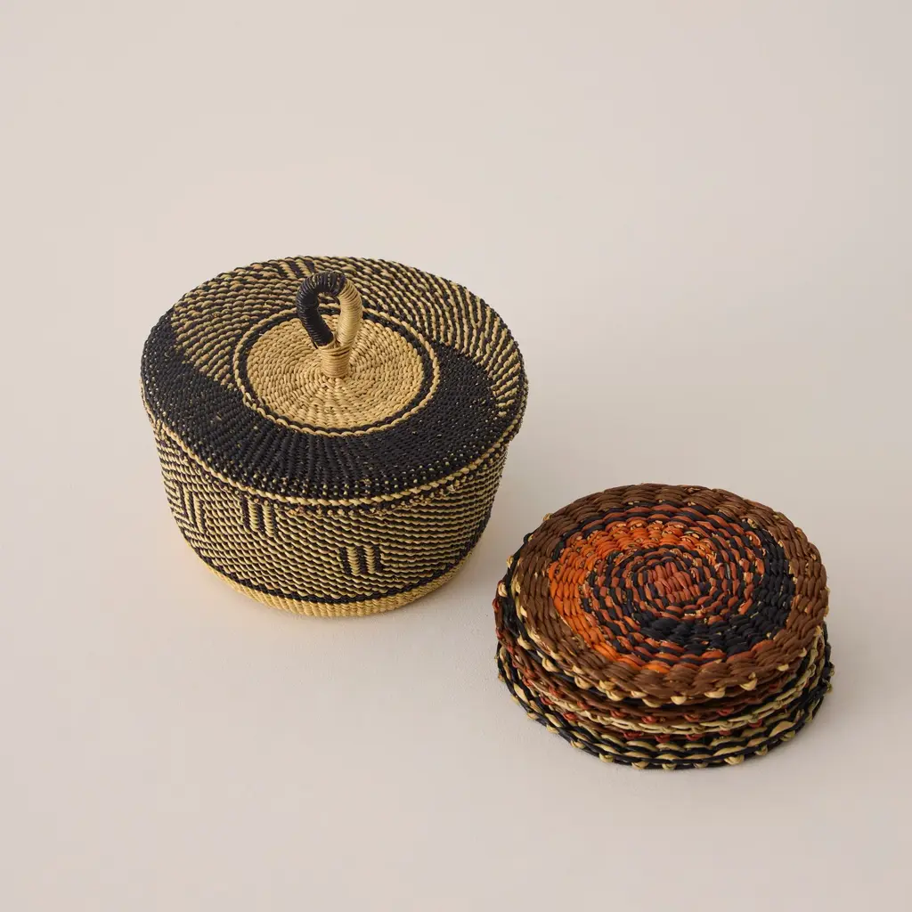 Bring both function and artistry to your table with this exclusive Coasters & Holder - Set of 6 from Baba Tree. Expertly handwoven in Ghana using time-honored techniques and sturdy elephant grass, each coaster combines durability with intricate design, protecting your surfaces in style. The coordinating lidded holder keeps them neatly organized while adding a decorative accent to your home. Every Baba Tree piece is crafted under ethical working conditions, providing meaningful income for its artisans. * This Coasters & Holder - Set of 6 includes 6 coasters and 1 mini basket with lid.