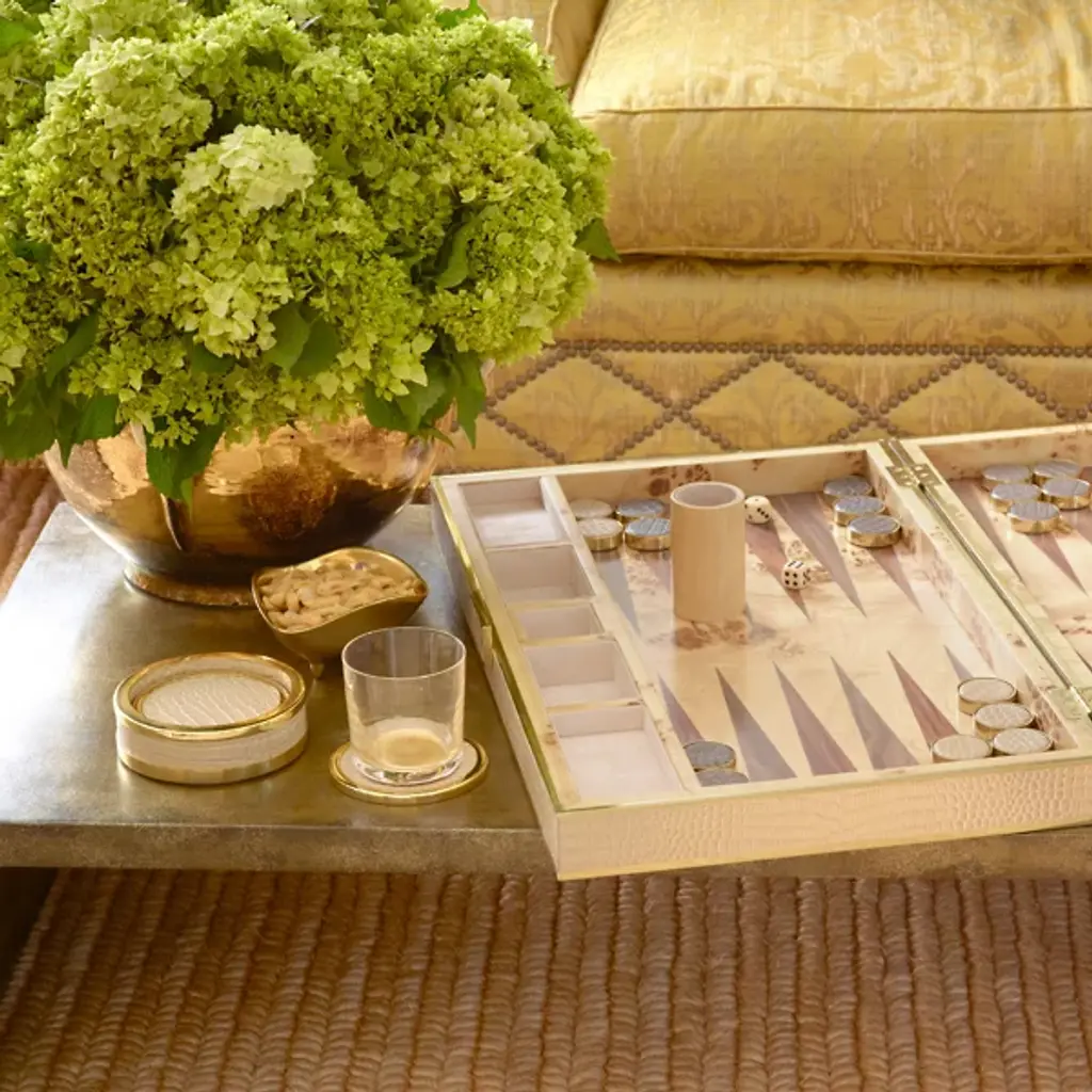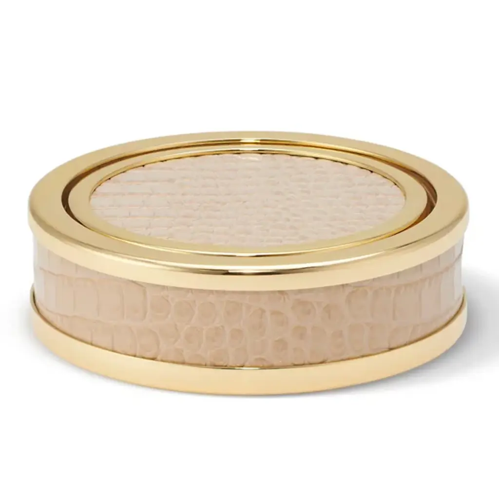 The Croc Leather Coasters, Set of 4 from AERIN is crafted from Italian leather that's been embossed to recreate crocodile skin patterns. Gold-toned brass rings frame each coaster, while suede undersides provide grip and surface protection. The set includes a matching holder that keeps all four coasters together between uses. This leather treatment creates interesting texture variations across each surface, making every coaster unique in its pattern. The combination of genuine leather construction with protective suede backing makes these coasters both luxurious and functional for regular entertaining needs.