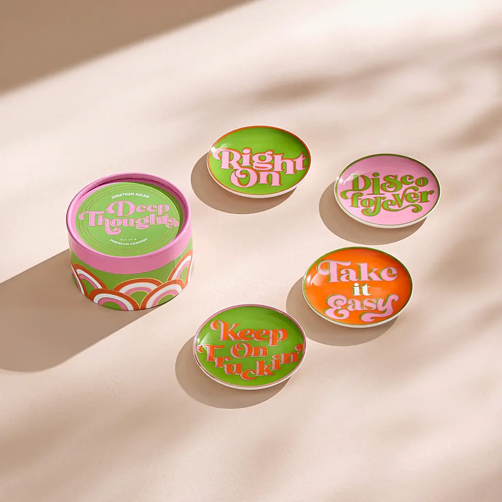 Seventies Slogans. Featuring profound bumper sticker sentiments rendered in couture materials with a rad retro palette, our porcelain Deep Thoughts coasters are just the bon mots to embolden your cocktails and give your get-togethers an air of quippy glamour. Packaged in a nifty gift box, they make a perfect hostess present (or pick-me-up for yourself).