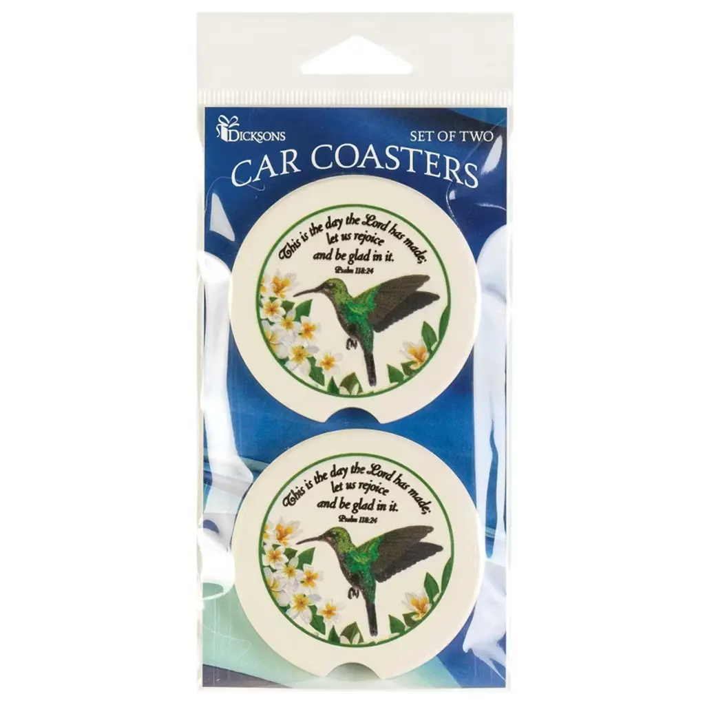 Comes as a matching pack of 2 coasters; Features a hummingbird with a floral design and sentiment reading "This is the day that the Lord has made, let us rejoice and be glad in it.". Coasters are made of absorbent ceramic material; Drop in your cars cup holder to absorb condensation. Measures approximately 2.5 inches in diameter; Features a small notched edge for easy removal; Fits standard size cup holders in most consoles. A perfect way to display your faith and add inspiration to your daily commute. Contained in protective packaging; Ready for easy gifting for a birthday, Mother's Day, Father's Day, or any special occasion.