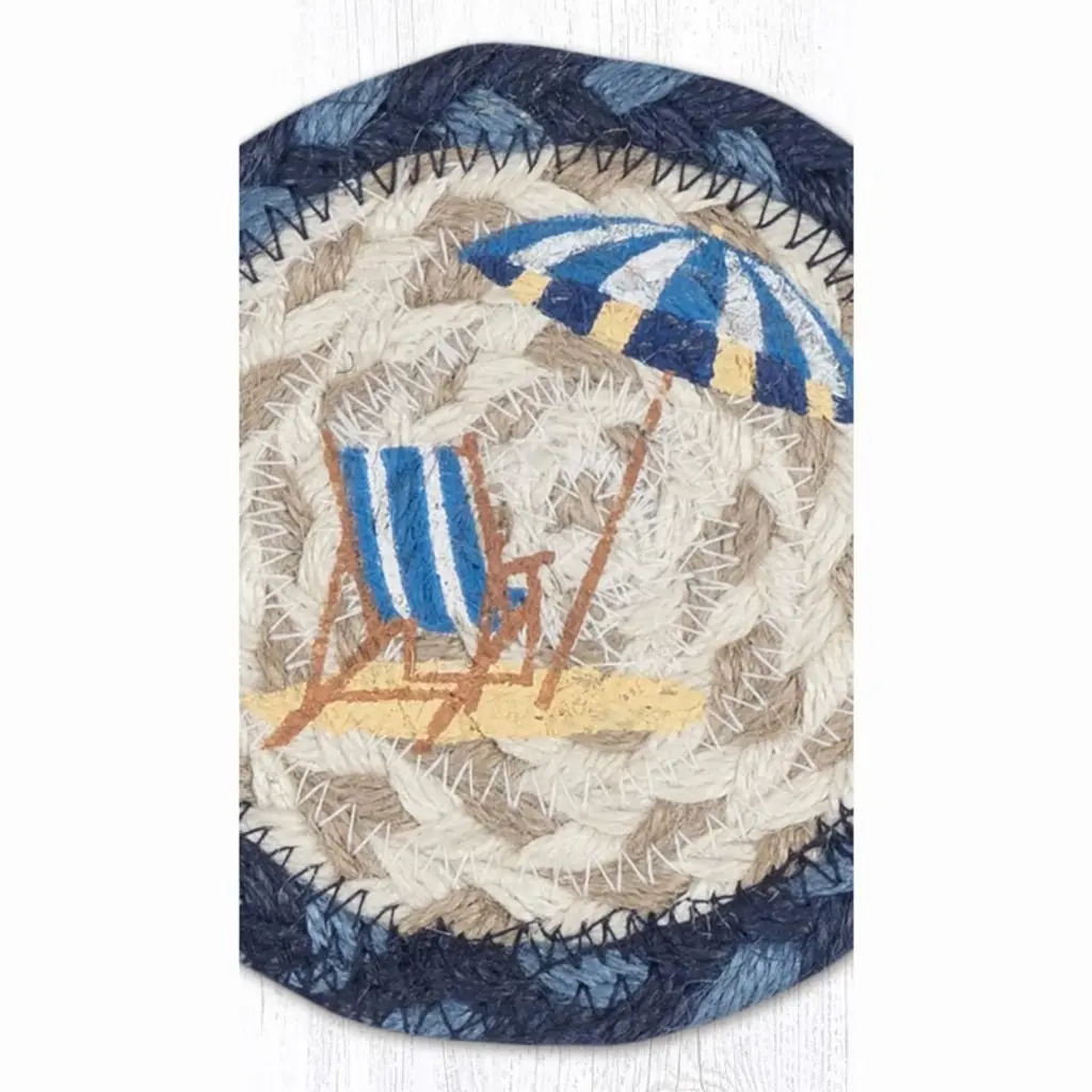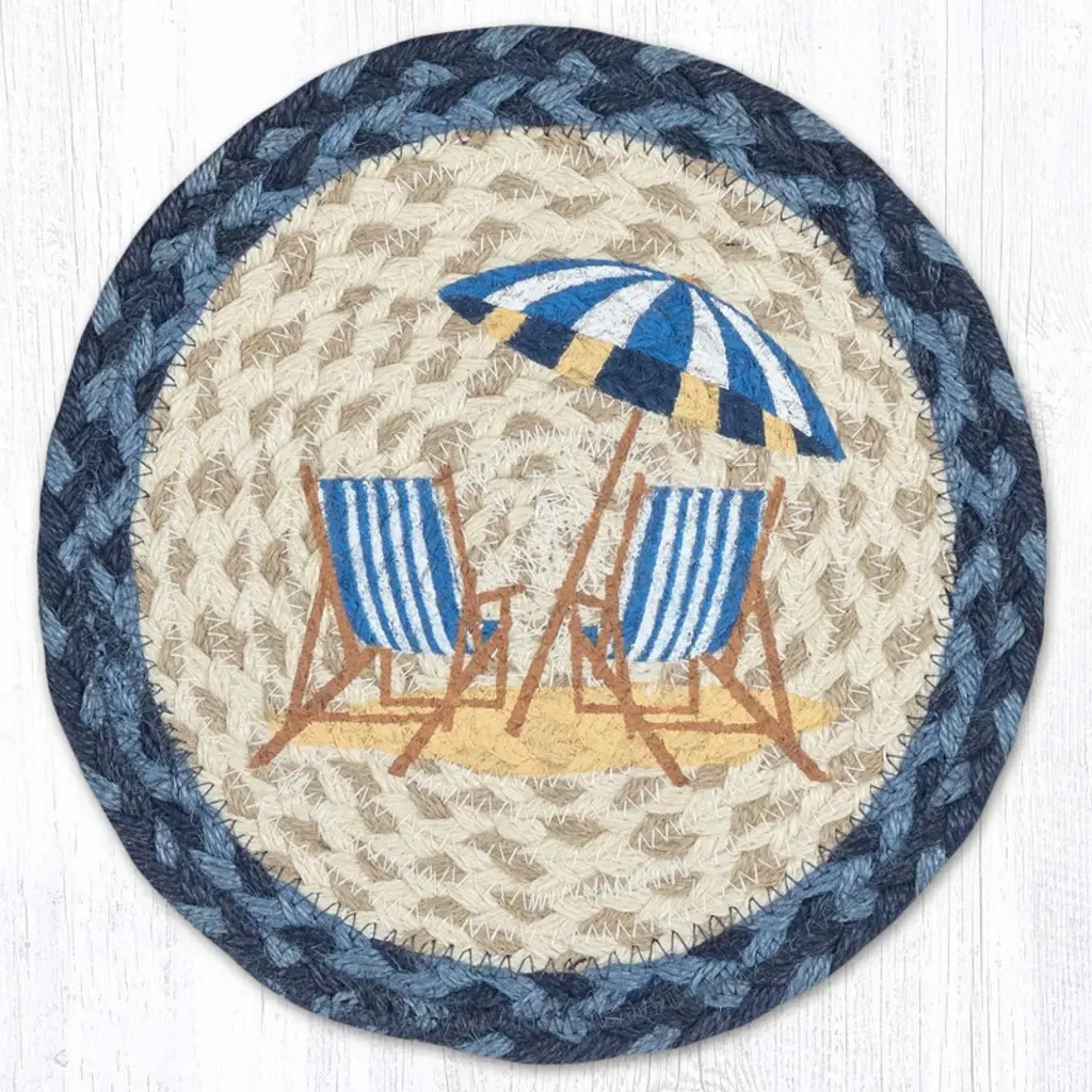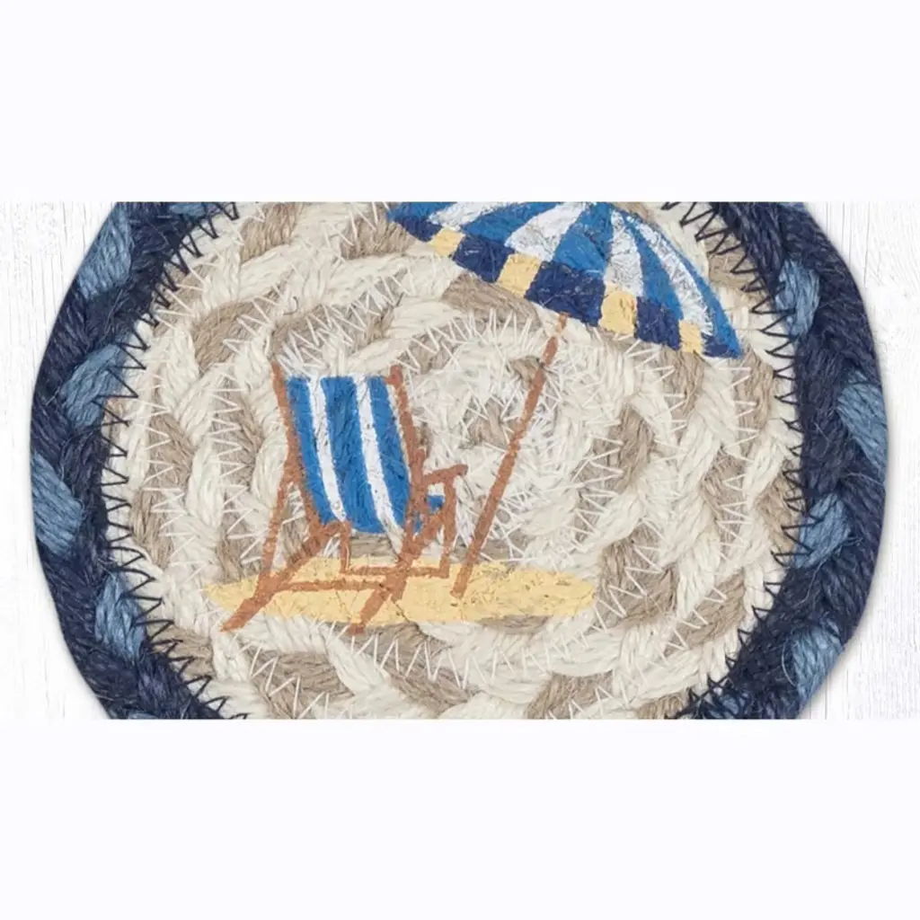 Bring a seaside vibe to your tabletop with the Earth Rugs Navy Beach Chair Printed Coaster. Measuring 5"x5", this handcrafted jute coaster features a charming navy beach chair print, perfect for coastal, nautical, or cabin-inspired decor. Key Features: Protect your surfaces with this 5"x5" Navy Beach Chair Printed Coaster. Crafted from natural jute, offering eco-friendly durability and rustic charm. Hand-stitched design ensures long-lasting quality and authentic craftsmanship. Navy beach chair print design adds coastal and seaside style to any table.Perfect for coastal homes, cabins, or nautical décor enthusiasts. Lightweight and versatile, ideal for daily use or gifting. Easy to clean with spot cleaning using mild soap and water.