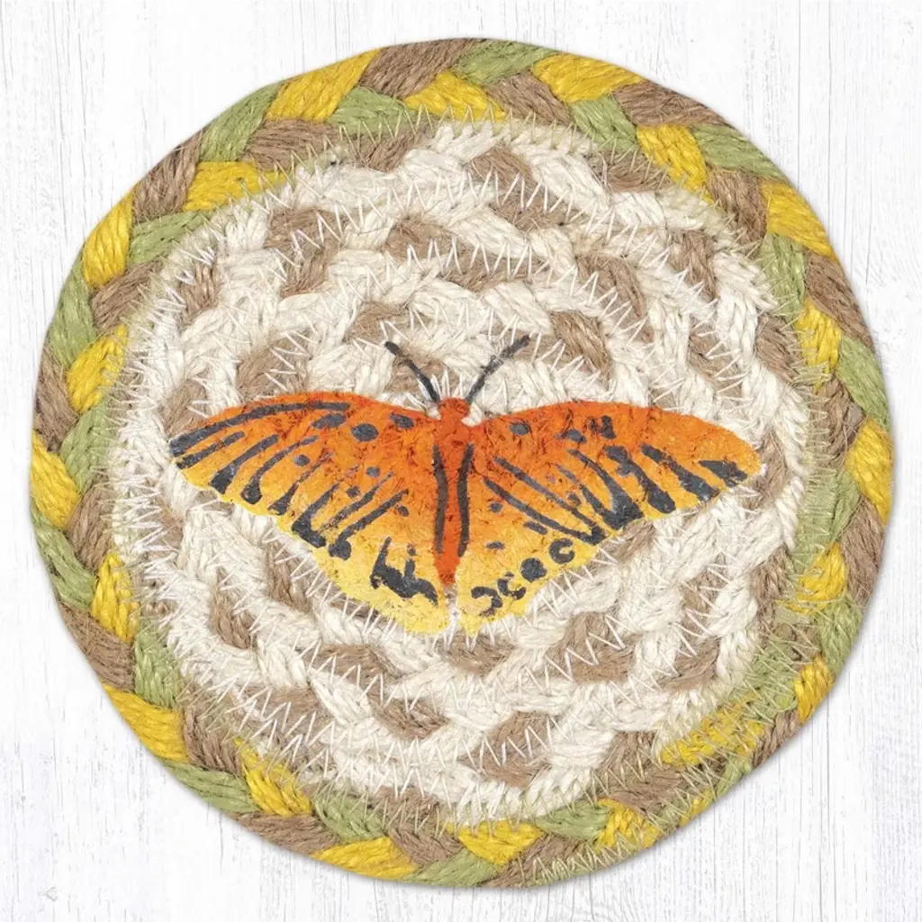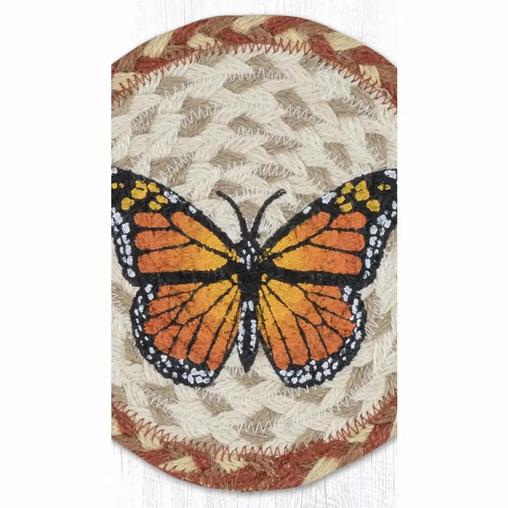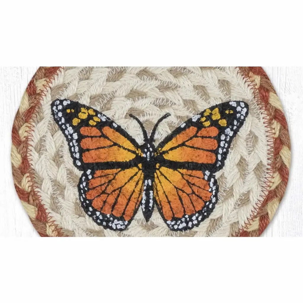 Brighten your table with the Earth Rugs Monarch Round Large Coaster. Featuring a detailed monarch butterfly design, this rustic accessory blends eco-friendly craftsmanship with natural charm. Key Features: Protect your tables with this oversized 7-inch round coasterHighlighted with a vibrant monarch butterfly motif for nature loversComplements farmhouse, cottage, and rustic lodge décor stylesCrafted from eco-friendly braided jute with printed artworkSturdy design fits mugs, glasses, or small serving bowlsEasy to maintain with simple spot cleaning