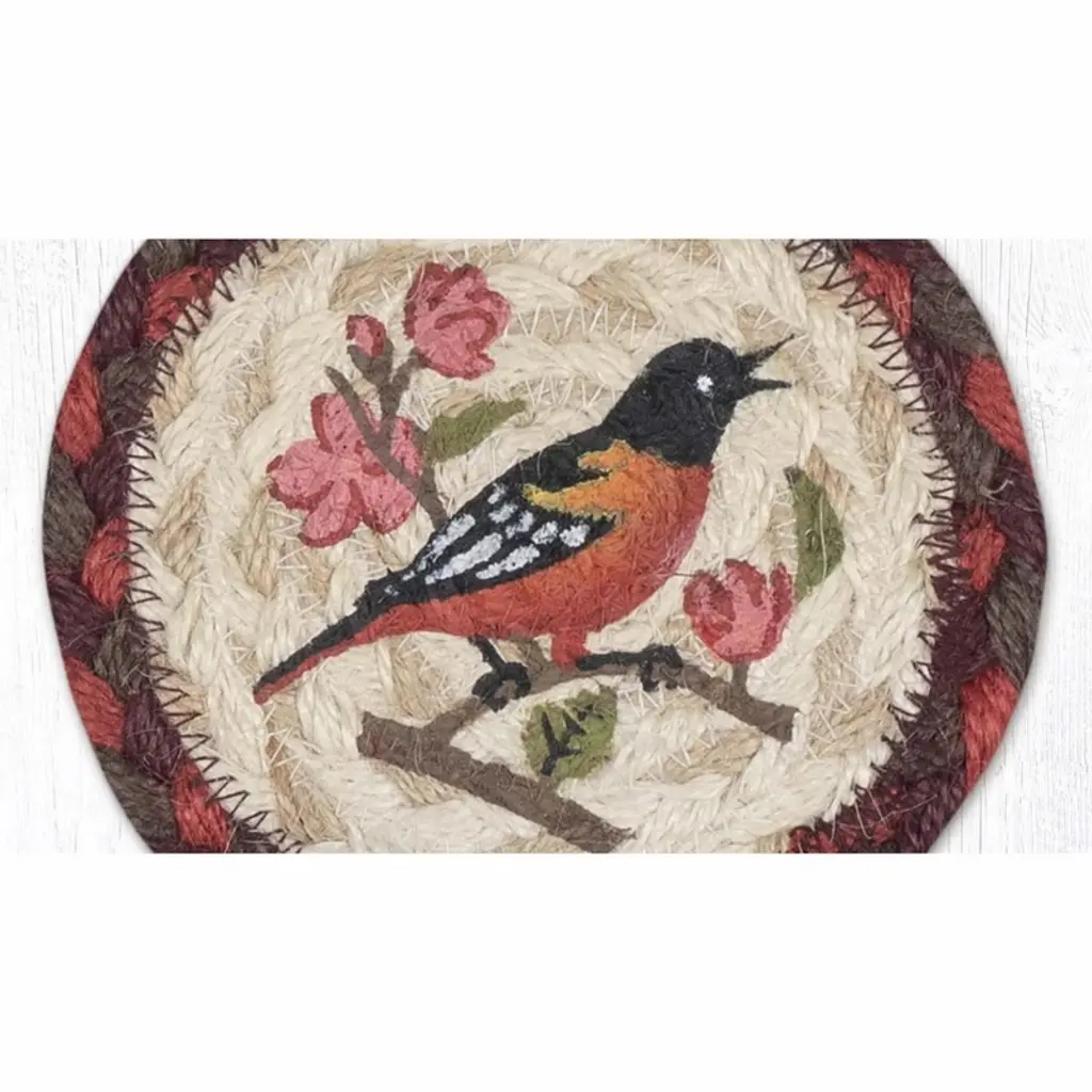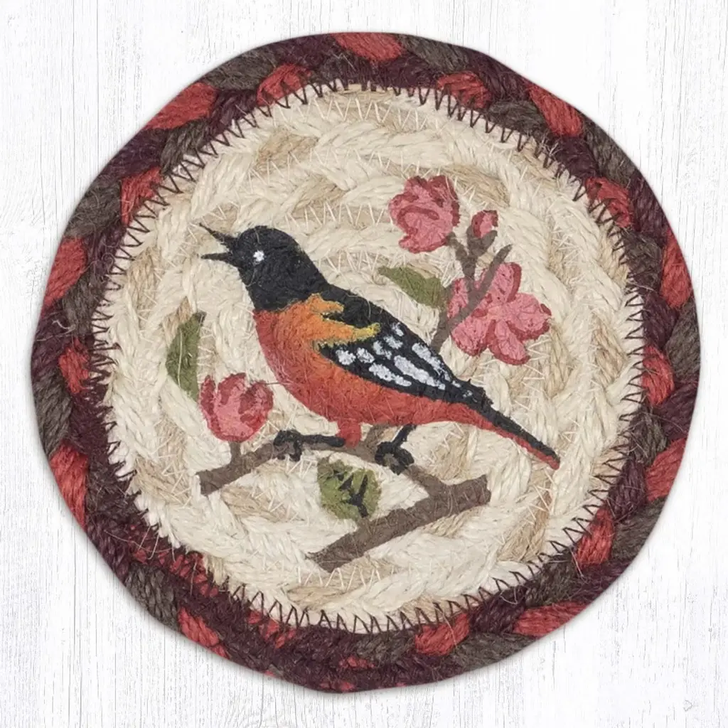Earth Rugs Wildlife Oriole Printed Coaster – 5"x5" Round Jute, Hand-stenciled Rustic Bird Decor For Tabletops