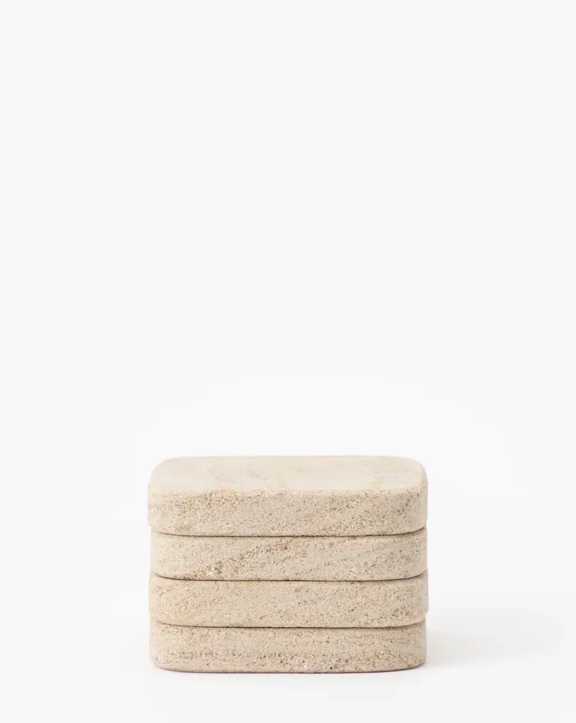 In a square design with rounded corners, the Egan Stone Coasters add character and maturity to a table setting. Each coaster is made with sandstone and displays unique details through its organic texture. These coasters protect your surfaces while elevating your tabletop decor.