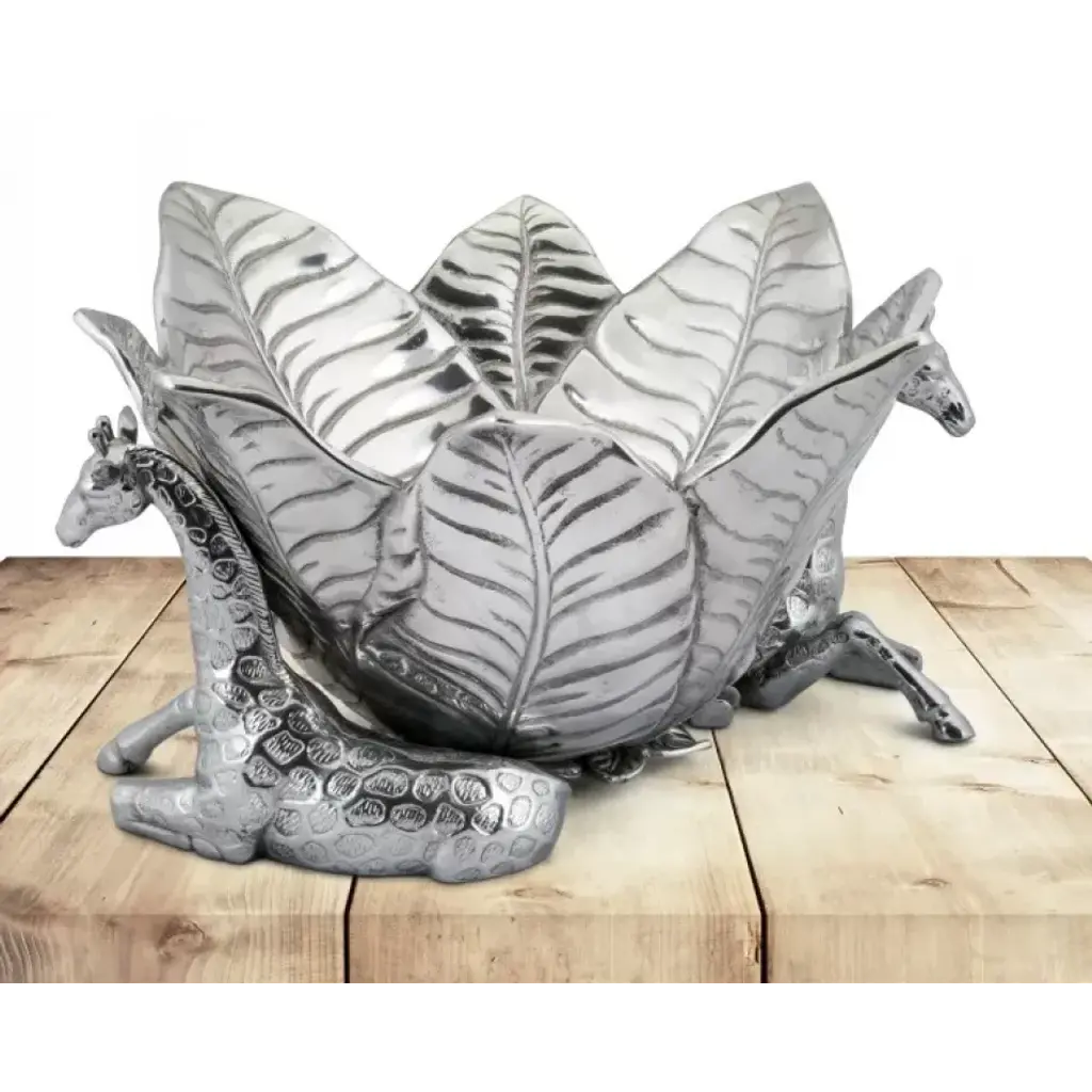 Let Arthur Court's Elephant Wine Coaster and Stopper Set provide you with all the tools for a successful evening. A large, detailed leaf creates the coaster's back support, while an elephant head forms the front. The animal's trunk weaves into a ring that holds the stopper, which is topped by an open crown of leaves. Handcrafted in sand-cast aluminum, the set displays a harmonious combination of detail in the veiny leaves and wrinkly skin of the elephant.