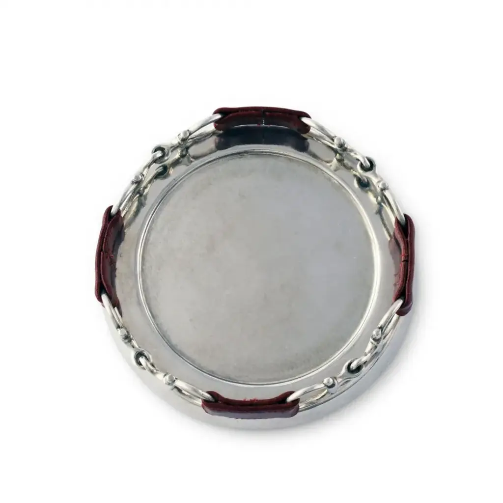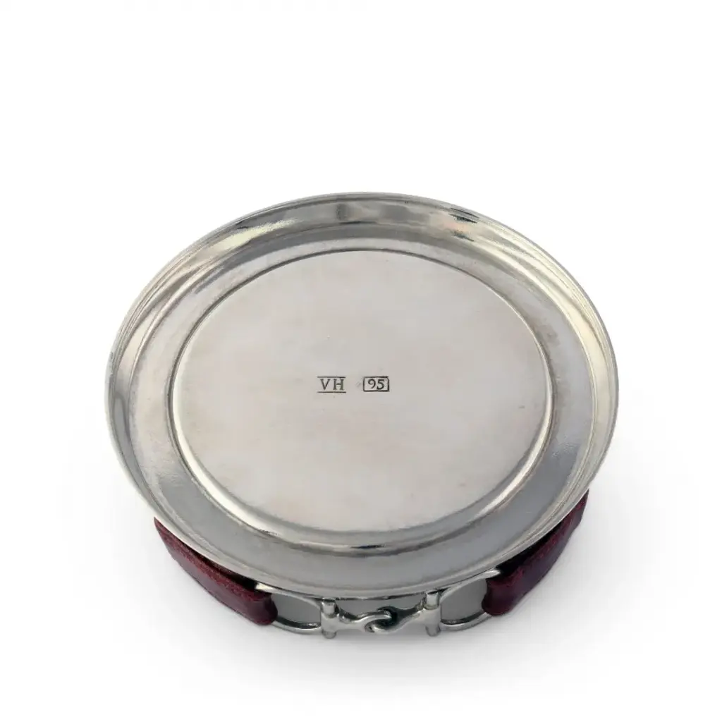 Lend a distinguished equestrian touch to garden brunches and wine tastings with this horse bit leather wine coaster. Artful craftsmanship, superior quality materials, and a finely rendered equestrian motif blend to create an exceptional accessory for your table and home bar. Made from premium leather and high-grade pewter, this subtly sized coaster—perfect for wine bottles—communicates your appreciation for both horses and fine wines. The distinctive, artisan-formed design makes it a perfect gift for sophisticated horse and wine lovers. Vagabond House is a family-owned American company specializing in fine pewter tableware, servingware and giftware. Largely inspired by nature, their exclusive products are designed to be unique, functional heirlooms for those who seek to express tradition and style in both family and formal entertaining.