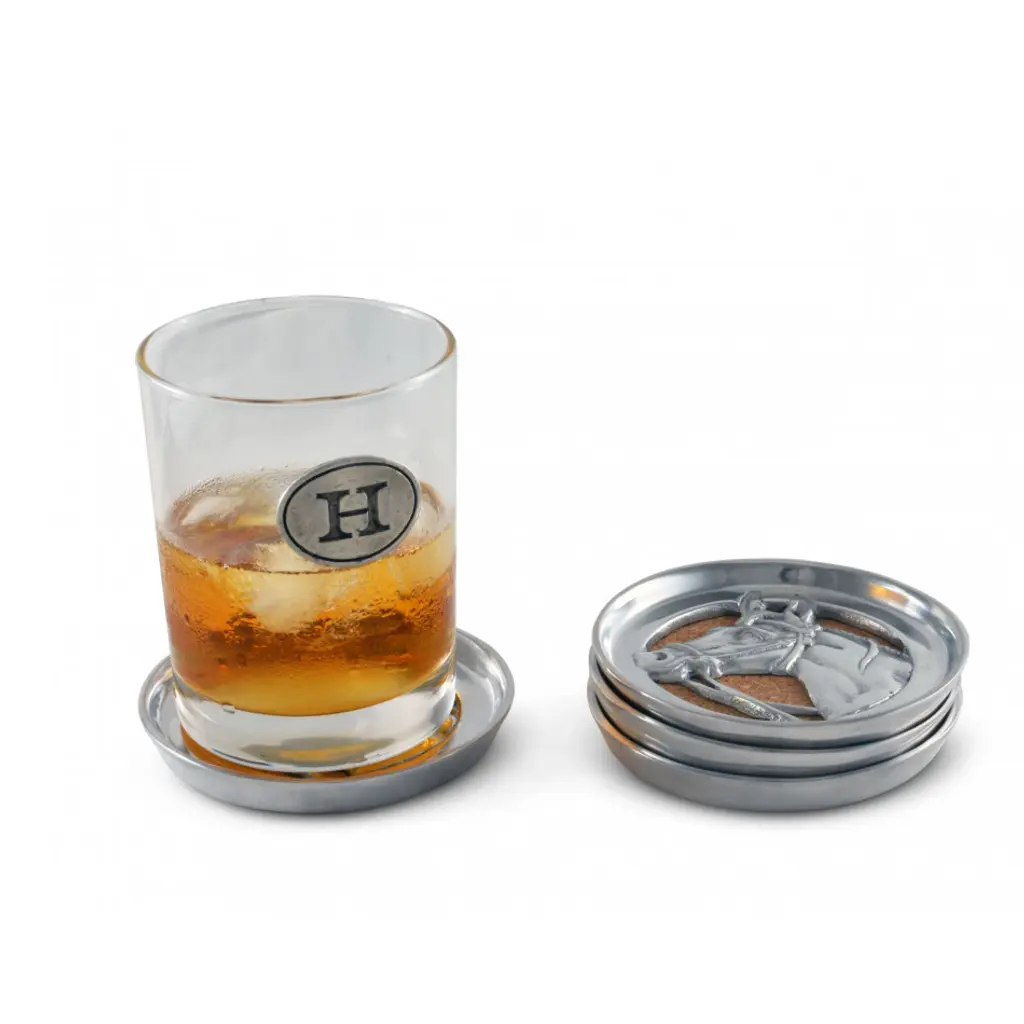 Arthur Court’s Equestrian Drink Coasters are sold in a set of four. Hand-crafted in our proprietary aluminum alloy, the round, rimmed coasters feature a detailed visage of a bridled Thoroughbred in bas- relief.