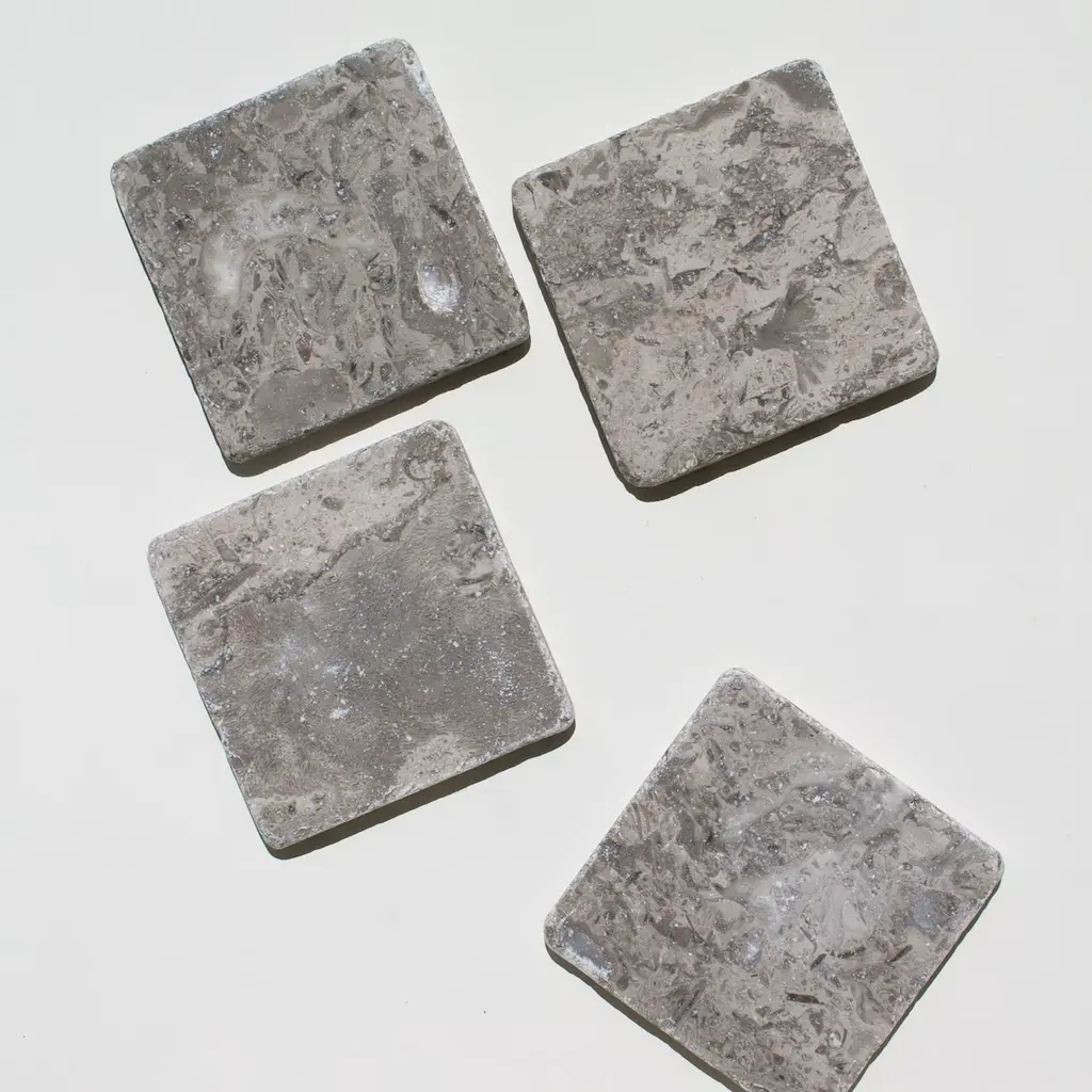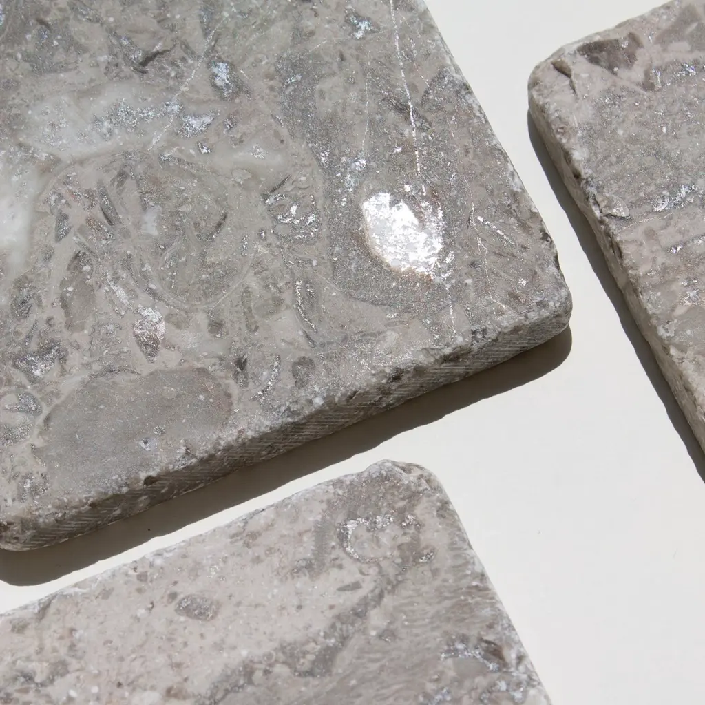 a warm grey colored marble that looks like a slice of fossilized earth. made from Mexican marble.matte to the touch, this marble resembles the closest form of raw stone.
