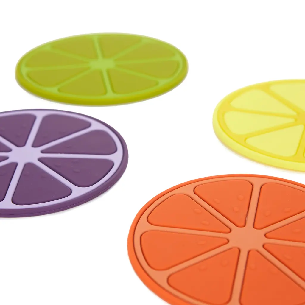 Delight your party guests with this set of coasters disguised as big, juicy slices of fruit. This set of four Fruit Party Coasters—in lime green, orange, lemon yellow and grape purple—is made from silicone, so they’re easy to clean, hygienic and pleasing to the touch. Dishwasher-safe. Each coaster measures 1.4h x 3.5"diam.