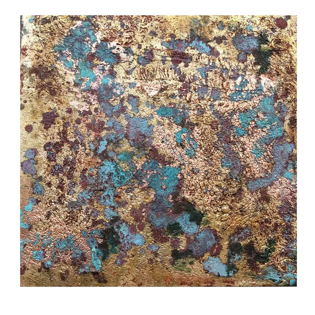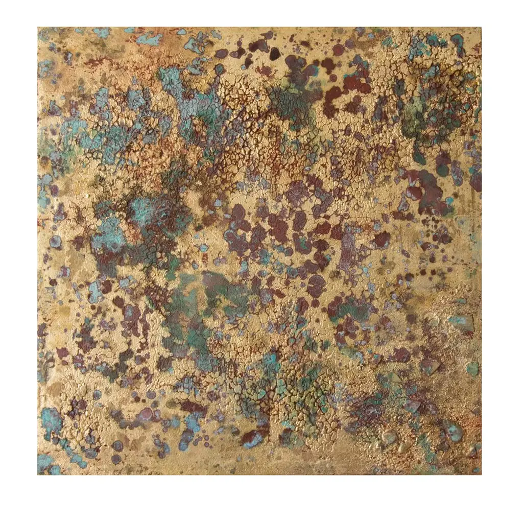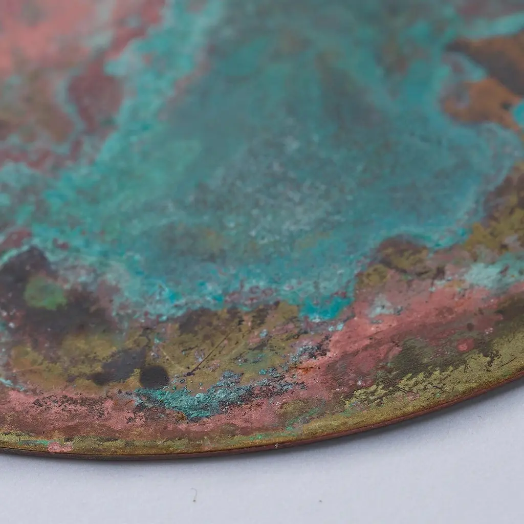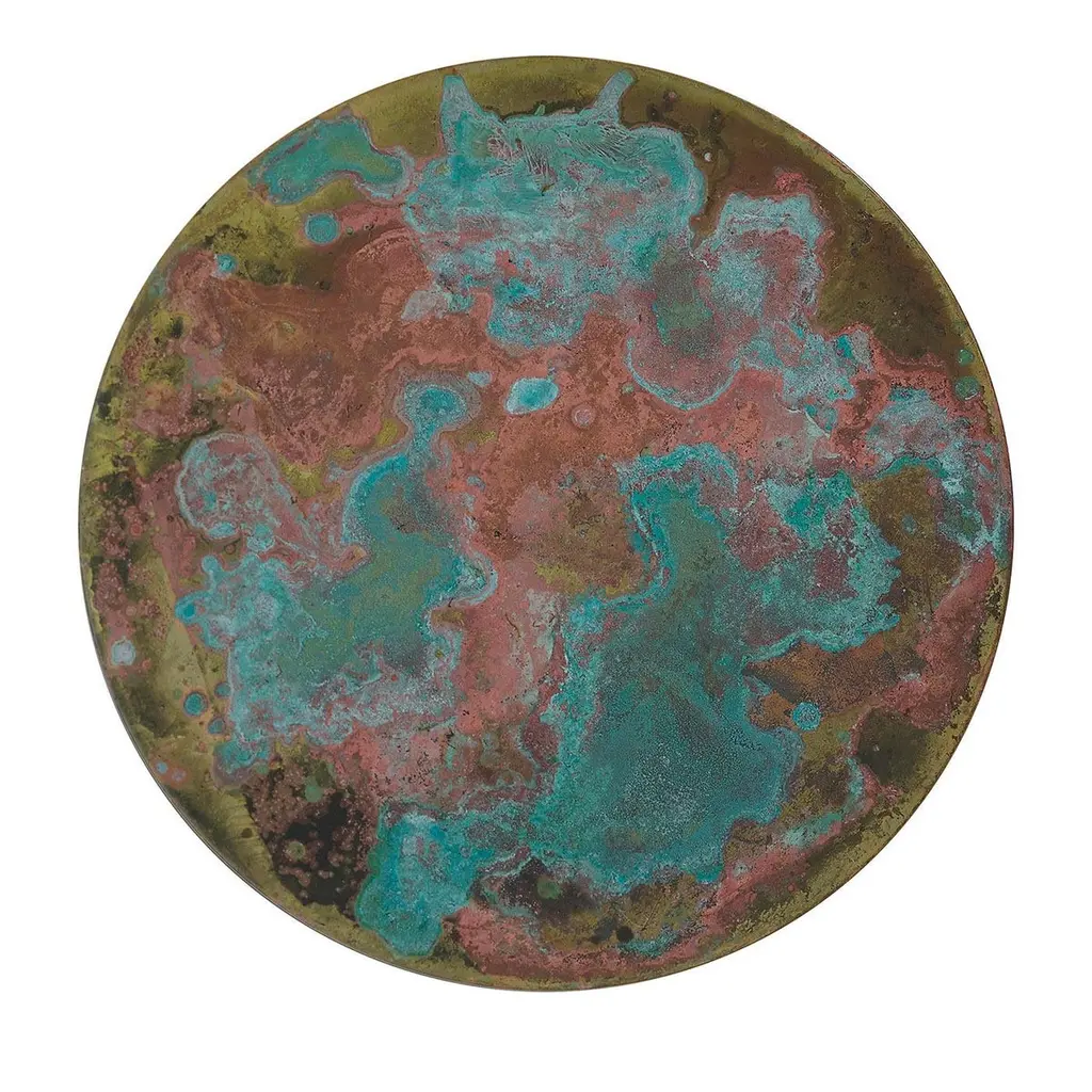 This set of six coasters is distinguished by a vibrant interplay of teal, burgundy, and green clouds accented with a dynamic corroded texture. Fashioned of brass, the pieces get handcrafted step by step, the treatment with acids and oxides lending them their singular look. Each coaster is protected by antioxidant layers and equipped with a velvety cover at the back for impeccable grip.