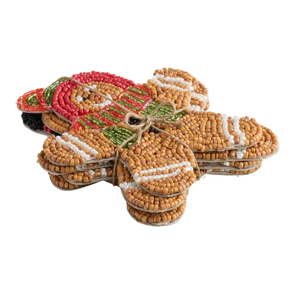 Add a dash of sugar and spice (and everything nice!) to your decor with our exclusive gingerbread-man shaped coasters. This set of four is handmade in India with a mix of beads and sequins creating smiling cookies dressed in dapper bowties, hats, and scarves. A festive extension of our fan-favorite beaded table decor, these coasters are a sweet setting for resting drinks and make a cheerful gift for any Christmas party host.