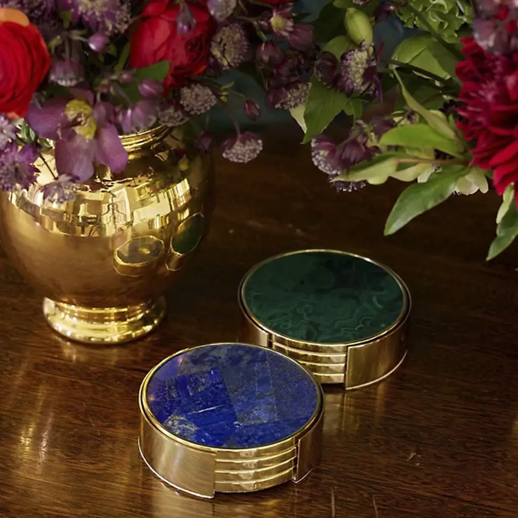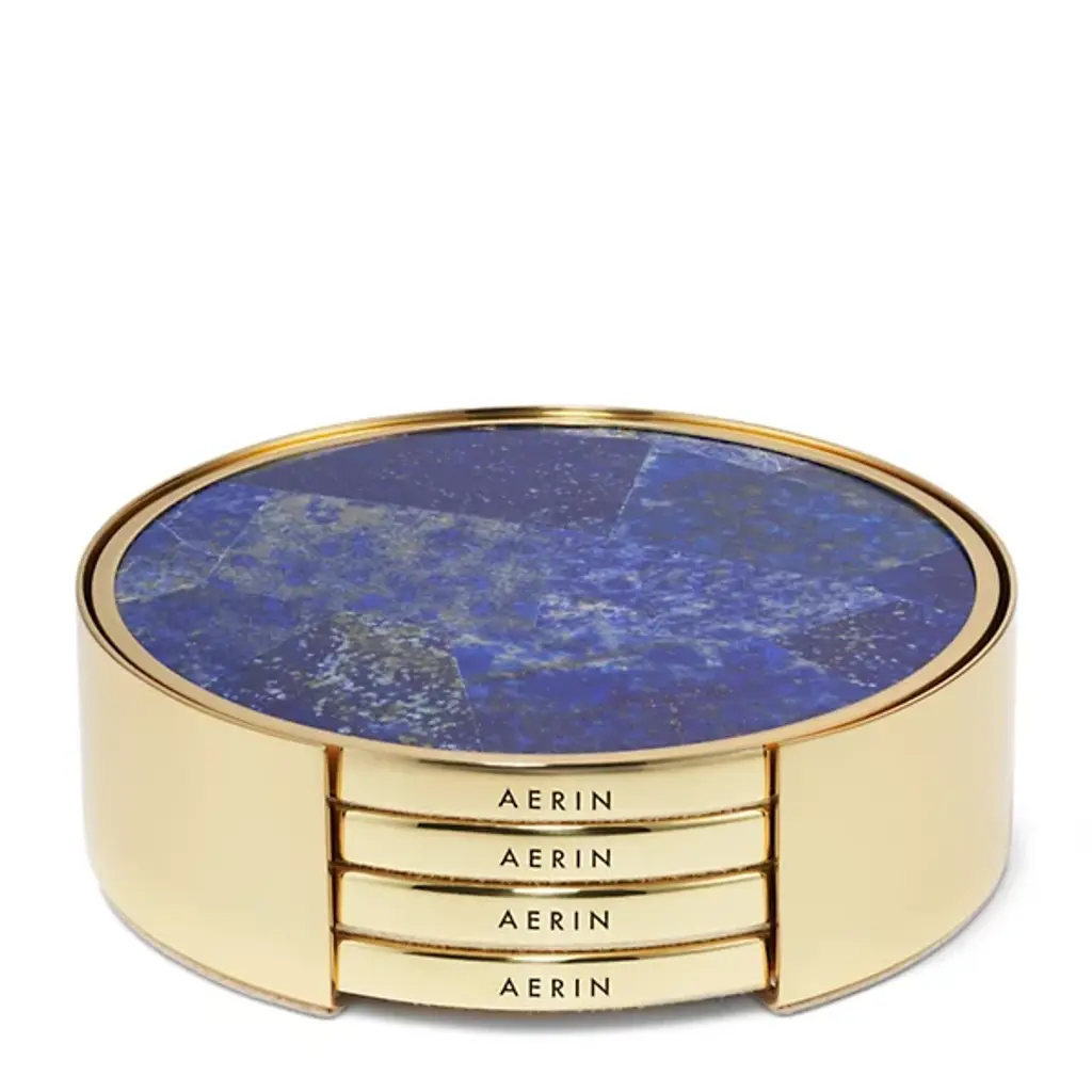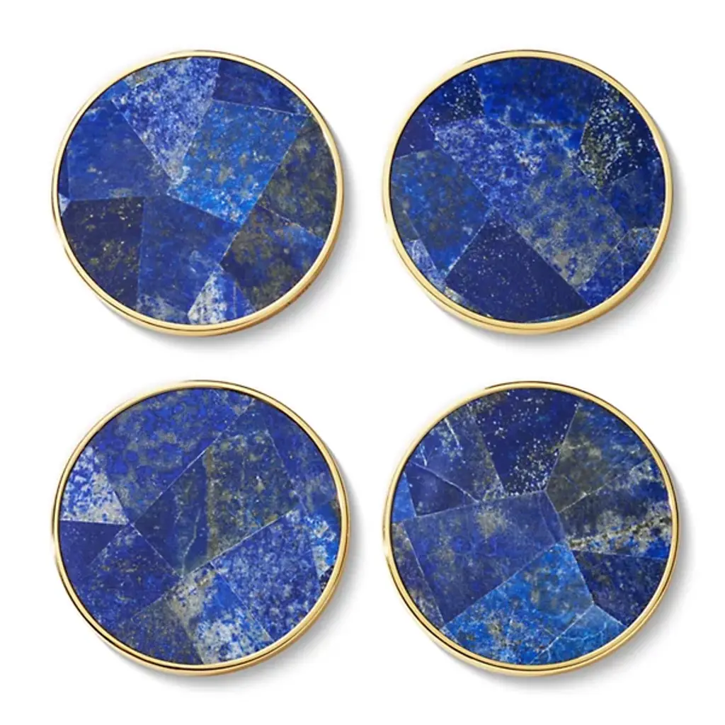 The Lucas Mosaic Coaster, Set of 4 from AERIN incorporates genuine lapis lazuli arranged in traditional mosaic patterns that echo centuries-old tilework techniques. Each semi-precious stone piece is carefully positioned to create intricate geometric designs, then framed with gold-toned metal edges. The four coasters nest inside a circular gold storage case that protects the stone surfaces when not in use. Natural variations in the lapis create unique tones across each surface, bringing historical artistry into modern entertainment.