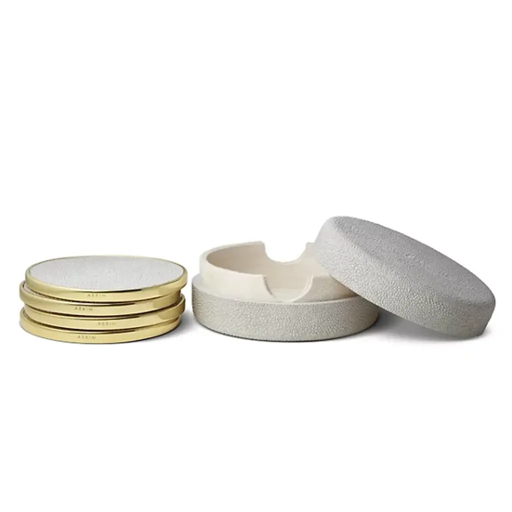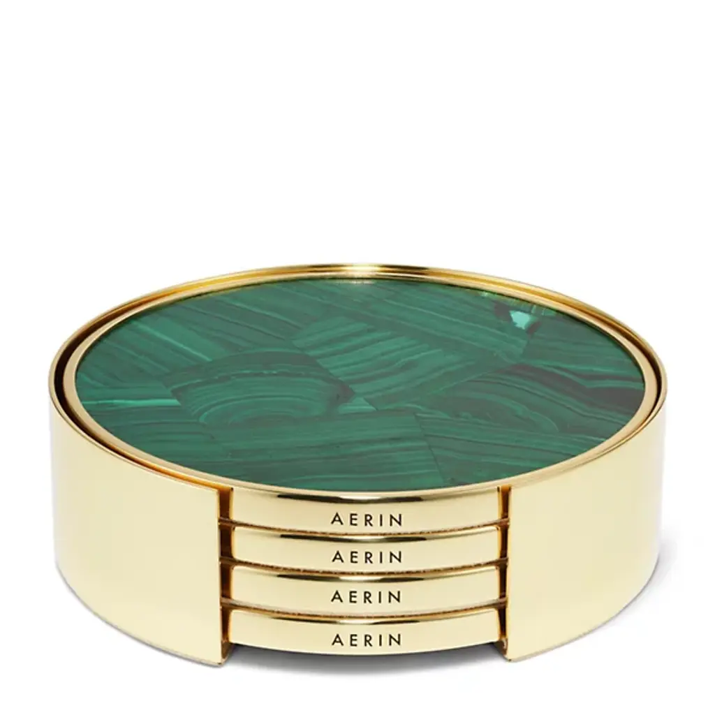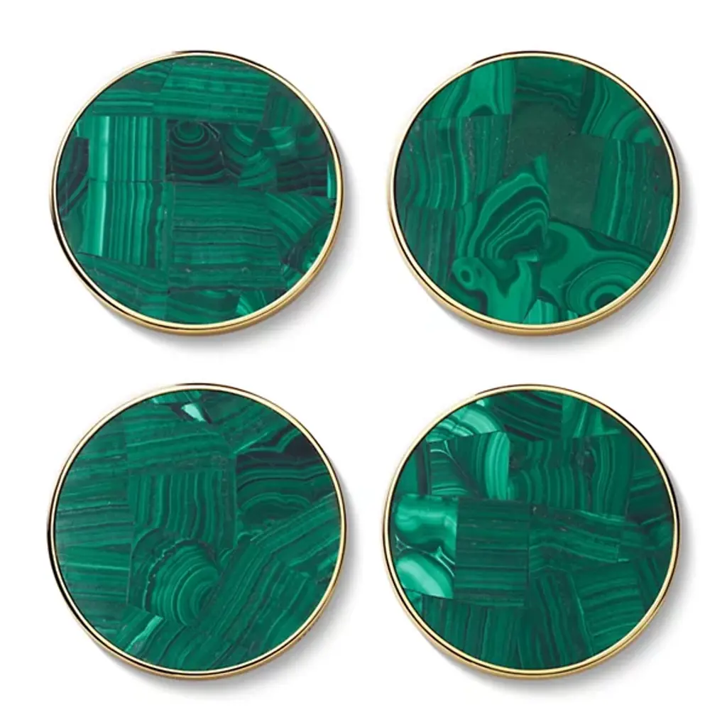 The Lucas Mosaic Coaster, Set of 4 from AERIN incorporates genuine lapis lazuli arranged in traditional mosaic patterns that echo centuries-old tilework techniques. Each semi-precious stone piece is carefully positioned to create intricate geometric designs, then framed with gold-toned metal edges. The four coasters nest inside a circular gold storage case that protects the stone surfaces when not in use. Natural variations in the lapis create unique tones across each surface, bringing historical artistry into modern entertainment.