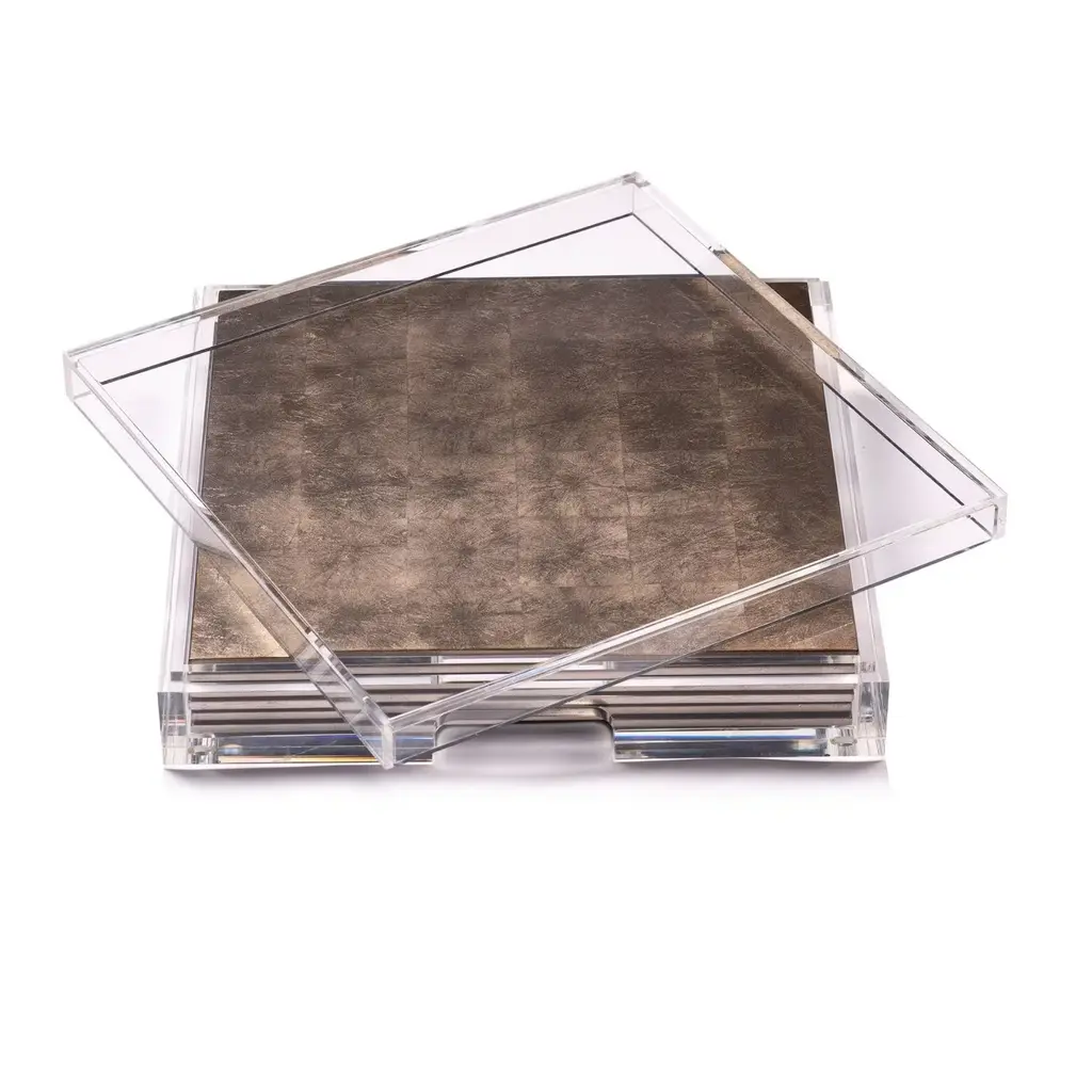 As chic as it is practical, this set consists of four golden acrylic coasters housed within a transparent acrylic holder.