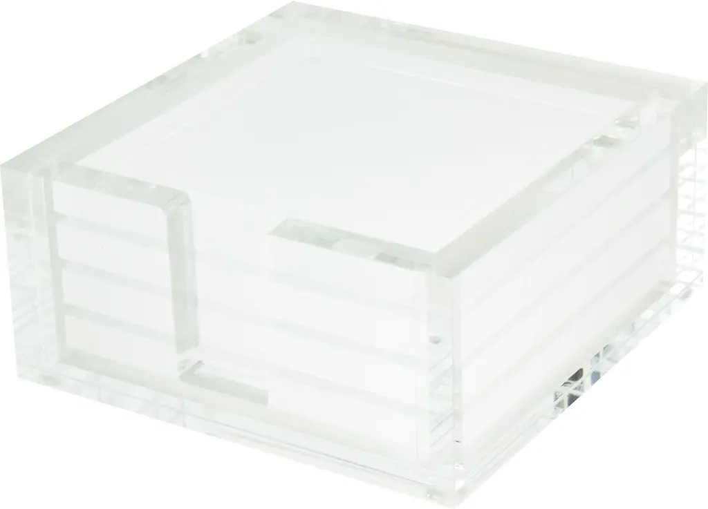 As chic as it is practical, this set consists of four white acrylic coasters housed within a transparent acrylic holder.