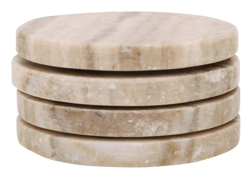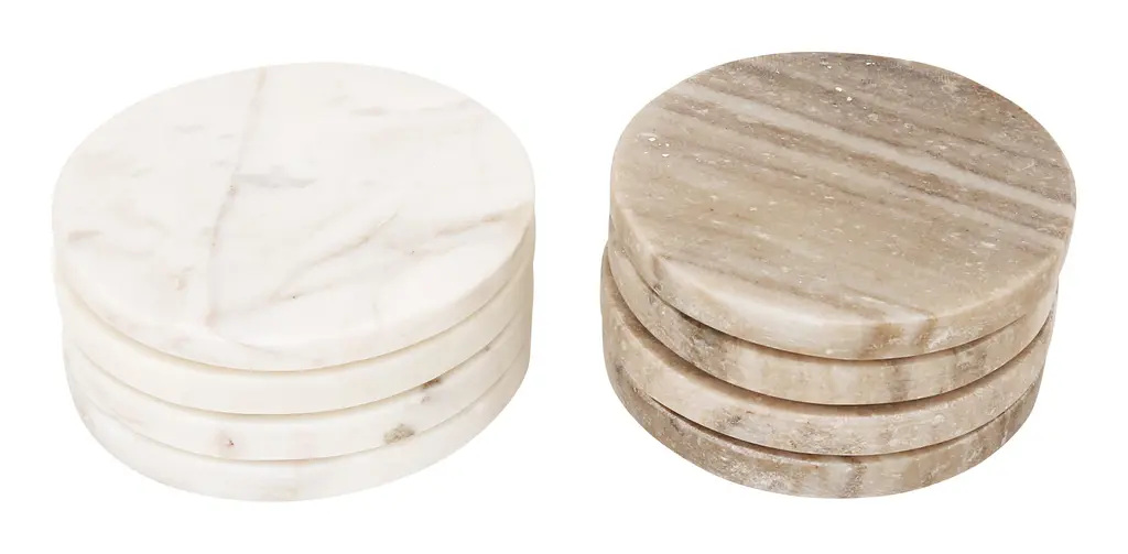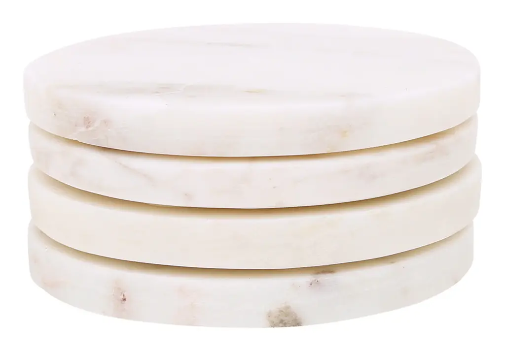 Protect your surfaces, but make it chic. Our Marble Coasters were handcarved in India from beautifully striated marble in your choice of white or warm grey. Perfectly sized for a mug or cocktail glass, they’re also pretty enough to leave out on the coffee table or bar when not in use. Crafted from natural stone, each one is completely unique. •handcarved marble•india•each is unique Dimensions •4" diameter x .5"H