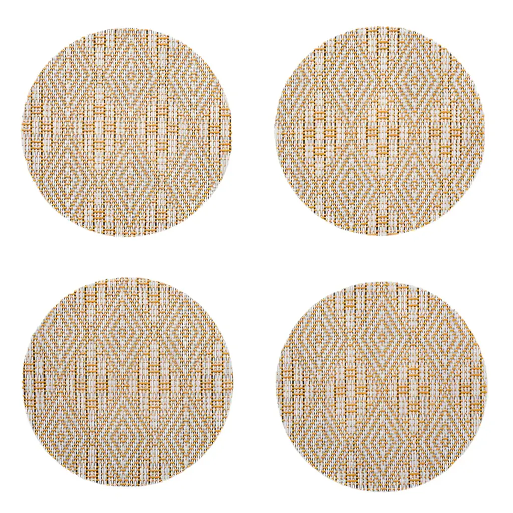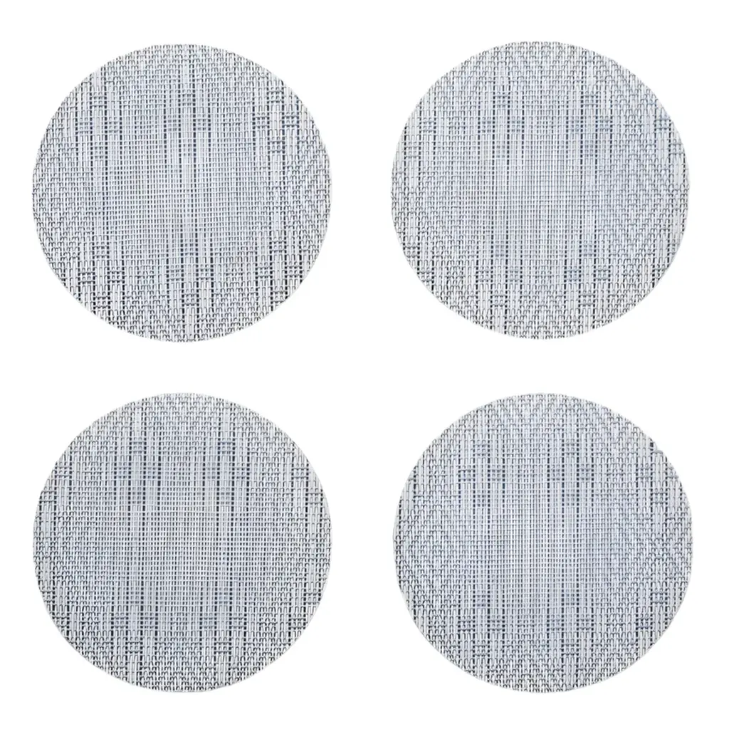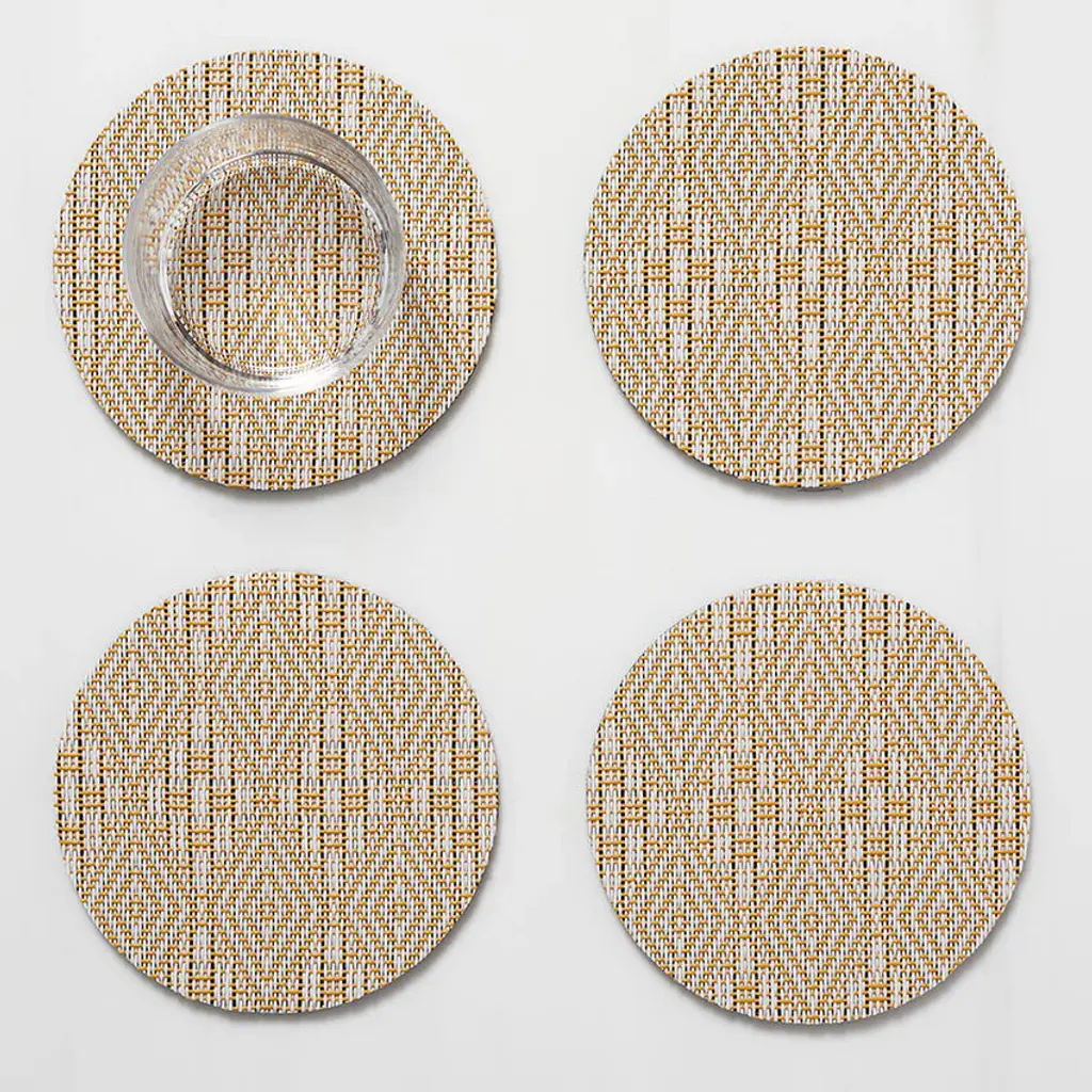 The Martha Stewart Boxwood Round Coaster Set from Chilewich presents an exquisite tabletop accessory from the distinguished Martha Stewart + Chilewich collaboration. These refined circular coasters feature an intricate lace-like weave that exemplifies sophisticated textile artistry, creating delicate visual interest through their meticulous construction. The thoughtfully curated chromatic palette draws inspiration from Martha Stewart's personal residences, offering an authentic expression of her renowned aesthetic sensibility. Highlights