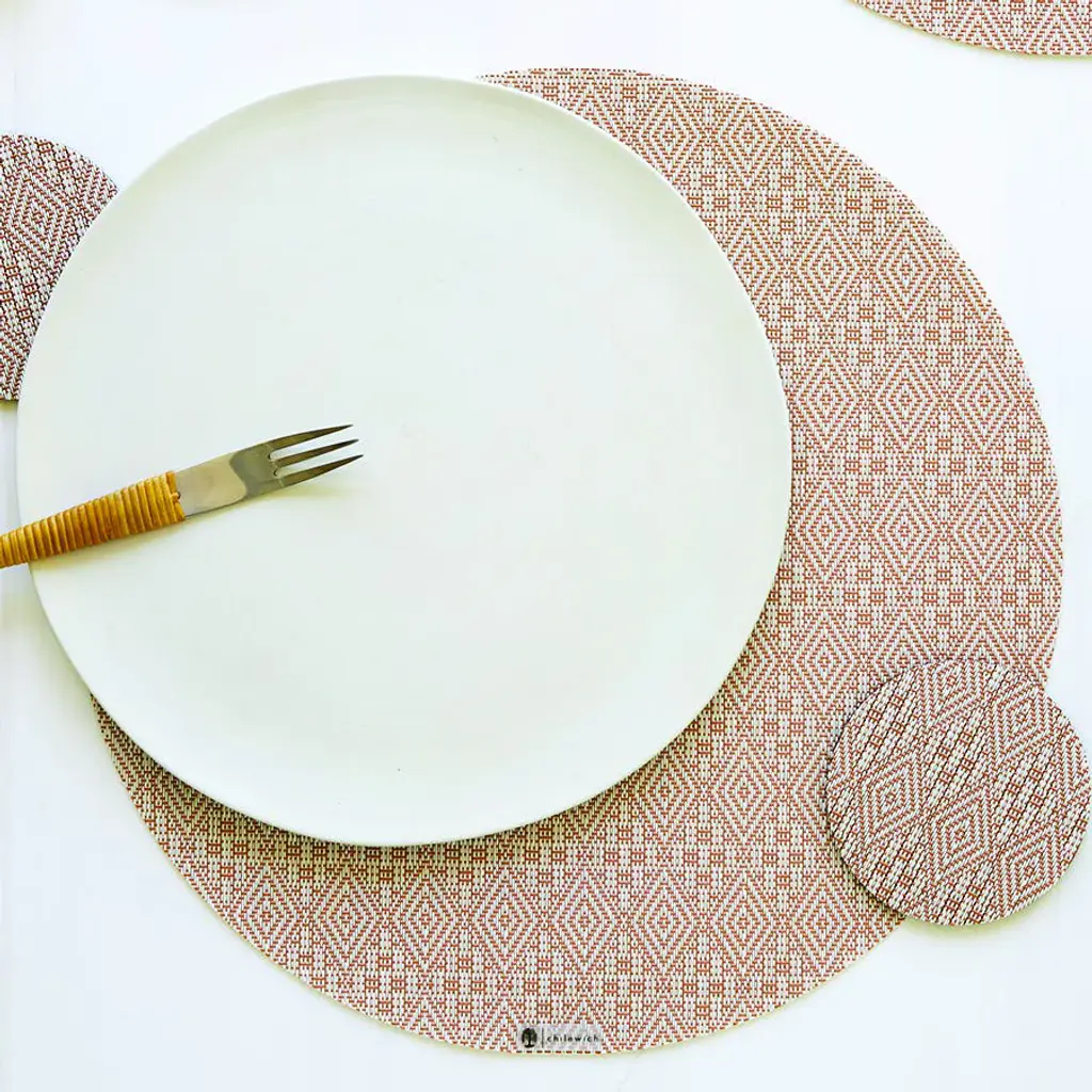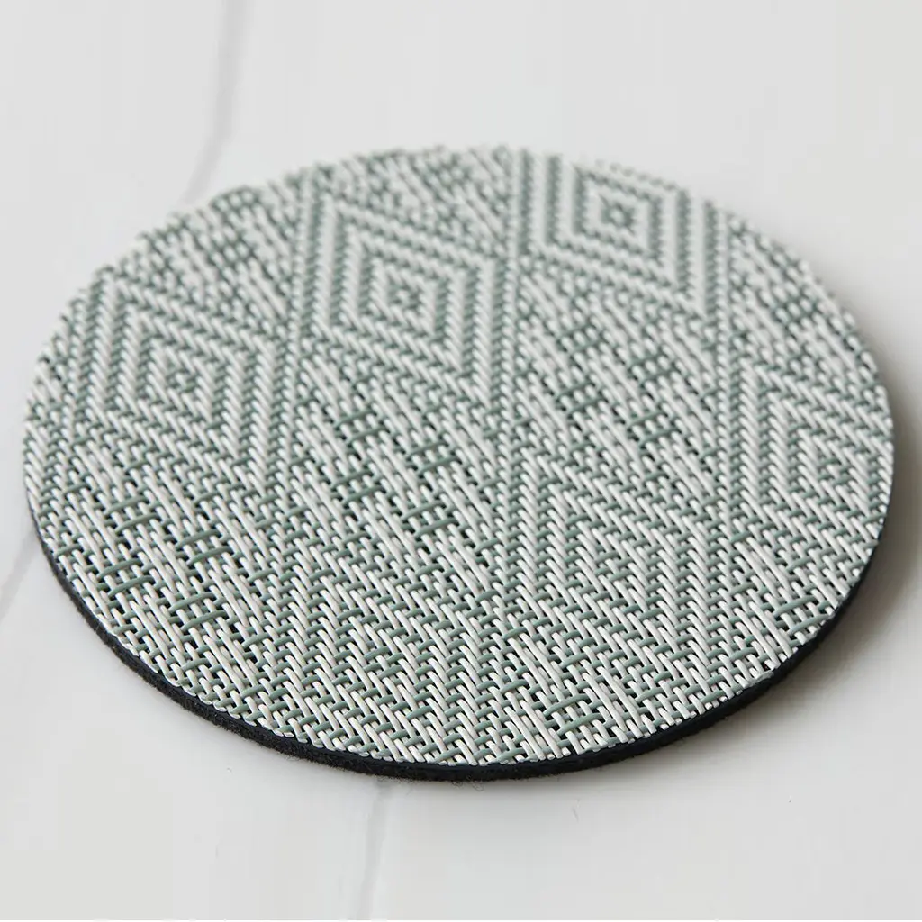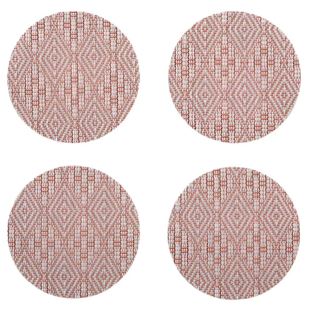 The Martha Stewart Boxwood Round Coaster Set from Chilewich presents an exquisite tabletop accessory from the distinguished Martha Stewart + Chilewich collaboration. These refined circular coasters feature an intricate lace-like weave that exemplifies sophisticated textile artistry, creating delicate visual interest through their meticulous construction. The thoughtfully curated chromatic palette draws inspiration from Martha Stewart's personal residences, offering an authentic expression of her renowned aesthetic sensibility. Highlights