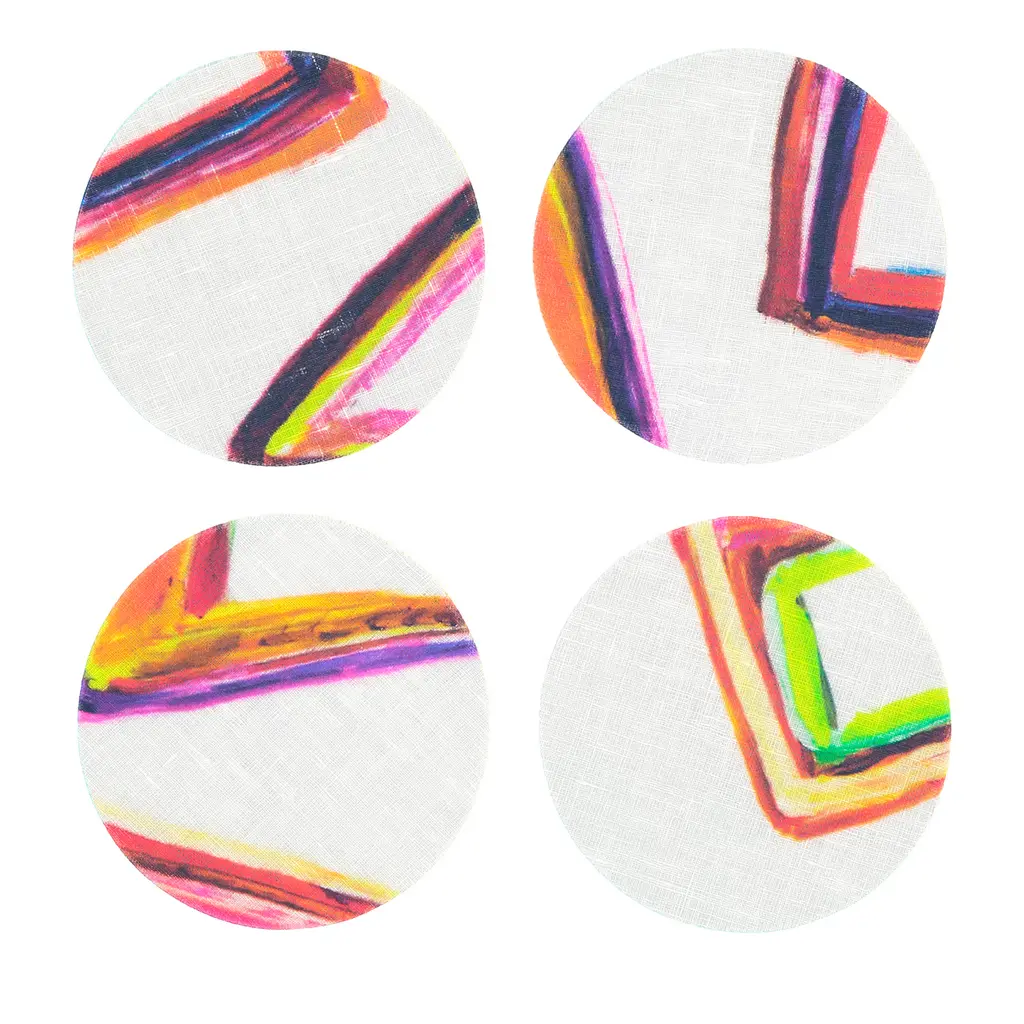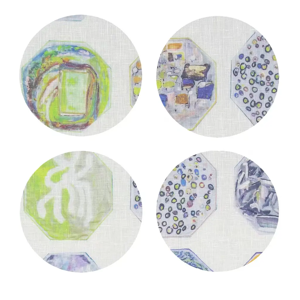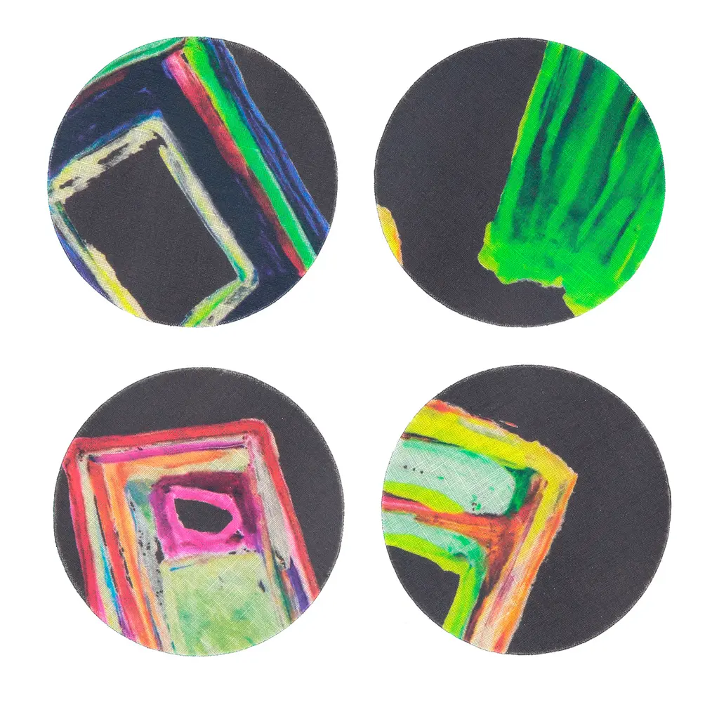 Distilling pure artistic charm, this set counts eight coasters each flaunting different glimpses of original handpainted artwork. The digital printing process on linen is responsible for the faithful rendering of its vibrant tones and minute brushstrokes, an aesthetic emphasized by a pleasant peach-peel texture. Easily washable with just a bit of water and soap, the coasters result flexible and resistant.