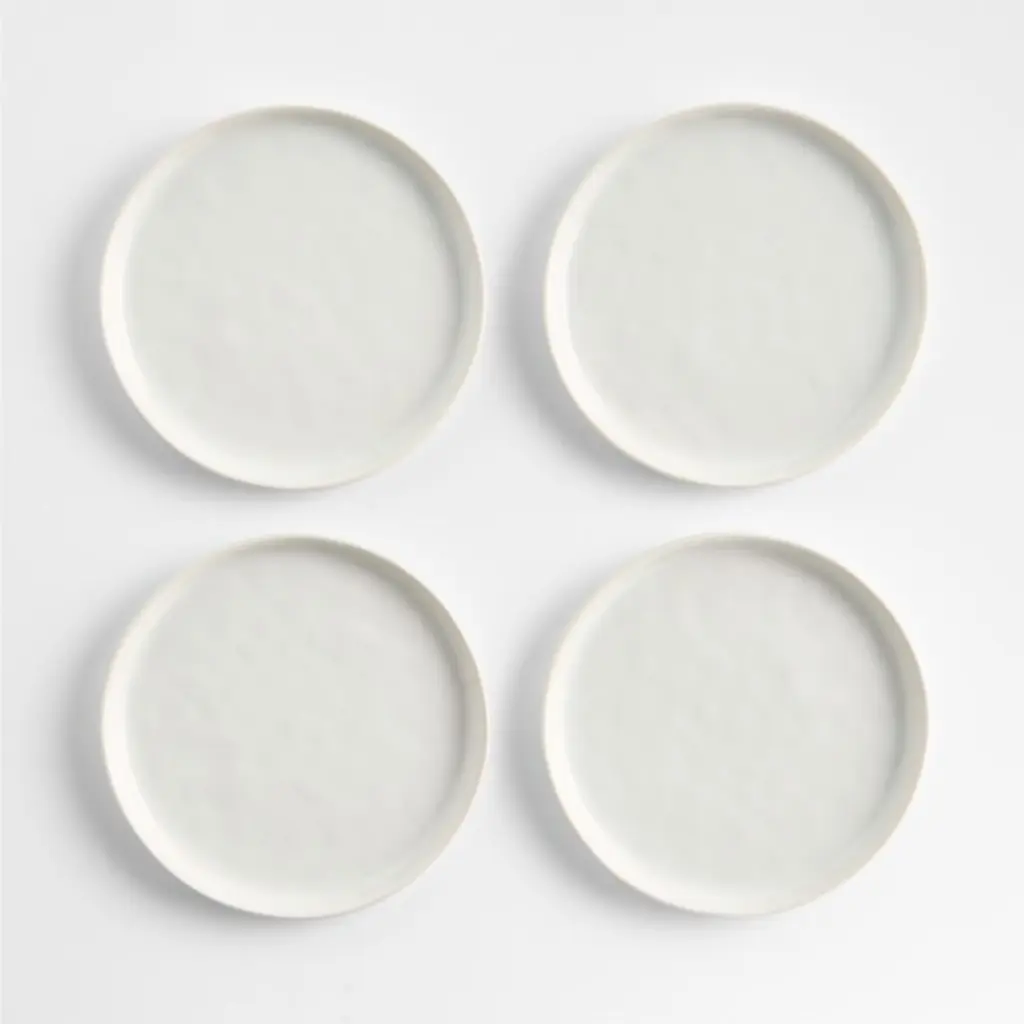 Based on our popular Mercer dinnerware, these coasters represent the same fusion of refinement and rusticity. The round slim profile of the coasters take on an organic overtone with freeform rims and a finely ""hammered"" surface that ripples the light. Smooth enough to not harm tables, the unglazed ceramic bottom gives each piece an artisanal look.