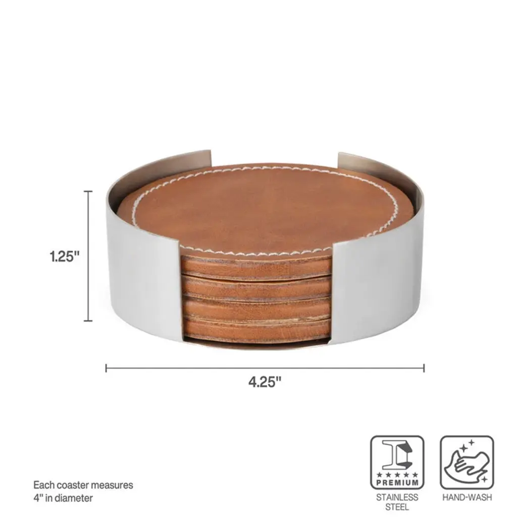 This unique leather accented coaster set, from Mikasa, is both traditional and modern but also timeless and sophisticated. It takes your home bar to new heights. This handsome coaster set will help prevent your drinks from slipping, staining and scratching your surfaces. Set includes four handsome leather coasters and a luxurious shiny stainless steel holder. Each coaster measures 4 inches in diameter; coaster holder measures 4 1/4-inches in diameter and sits 1 1/4-inches high. To clean, wipe coasters with a damp cloth.