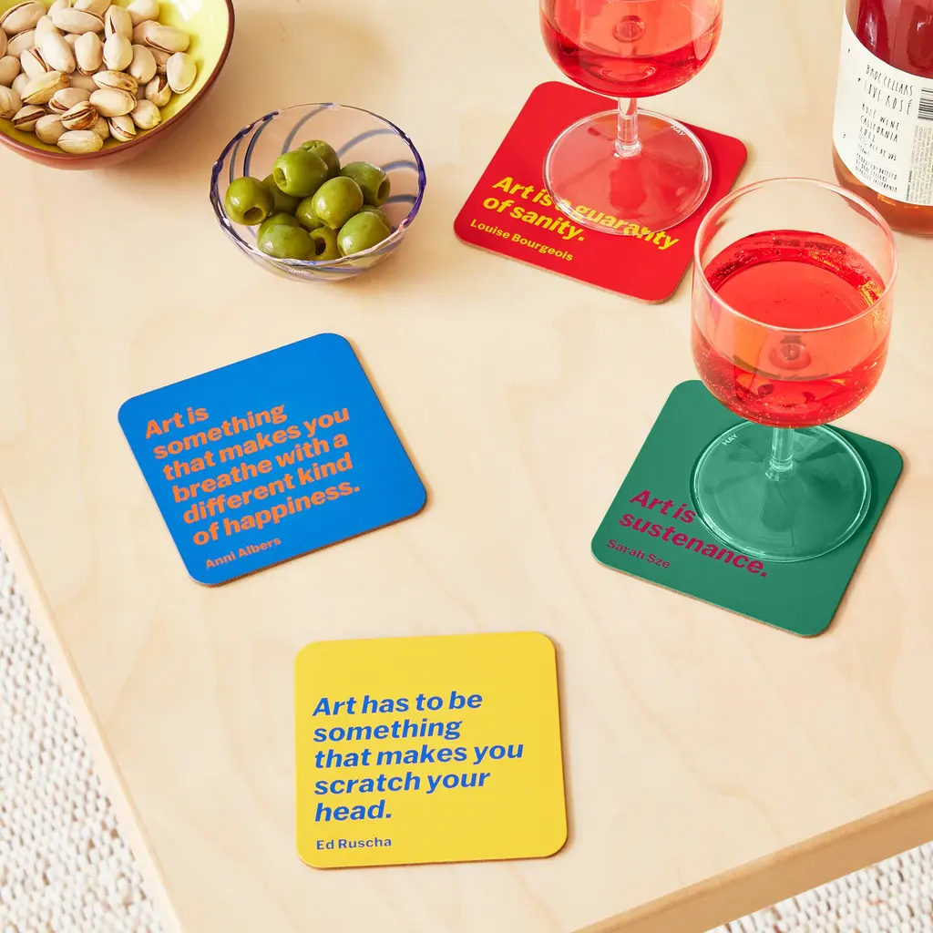 MoMA Exclusive: A real conversation starter for your next cocktail party. This brightly colored coaster is printed with a quote from an artist represented in MoMA’s collection. The MoMA Artist Quote Coaster measures 4”sq.