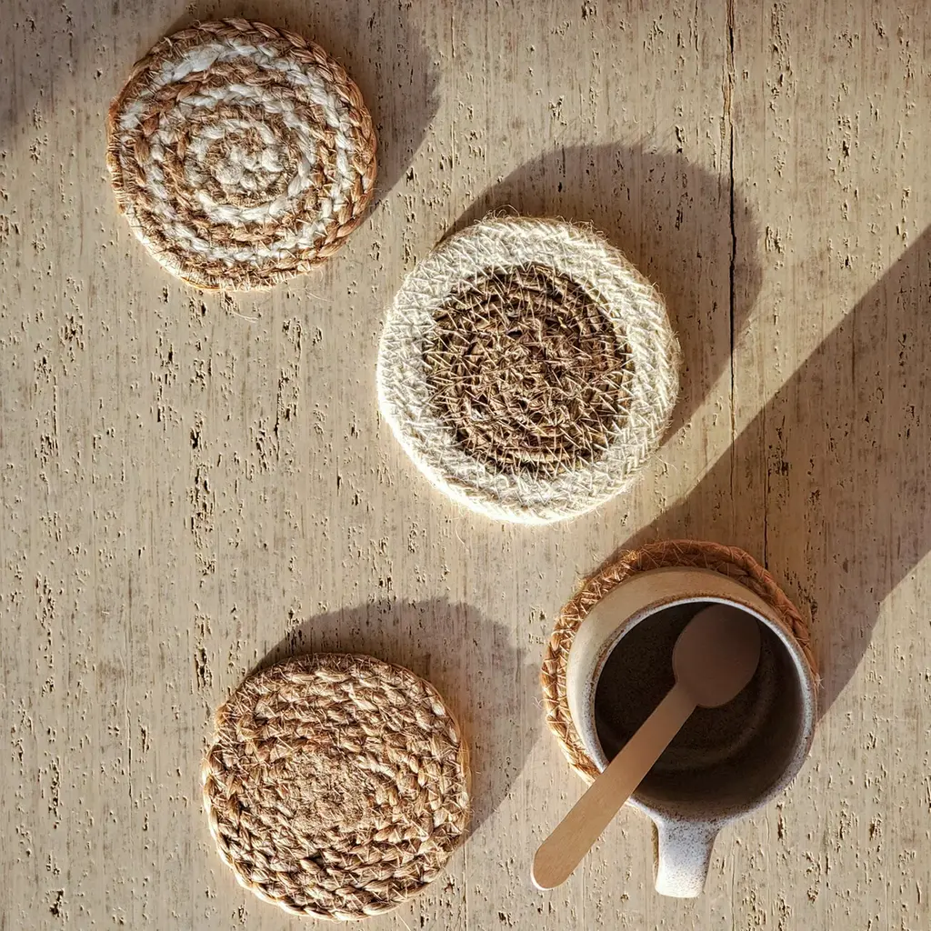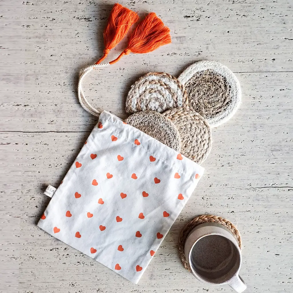 An assorted coaster gift set (x 4) handmade with 100% Jute and seagrass, these coasters are an easy gift for friends & family or as a stylish way to keep your table protected from scratches and watermarks. Durable, absorbent, and neutral enough to go with any decor style.Include a reusable "Hand Screen Printed Drawstring Pouch" handmade by Bangladesh Women Artisans. - Perfect Sustainable Gift for Earth-Loving Lovers! Each product is designed and curated by Korissa, sustainably handmade by Fair Trade artisans in Bangladesh.