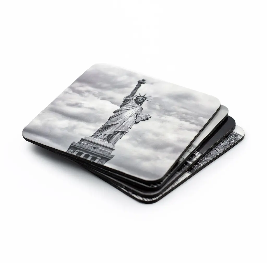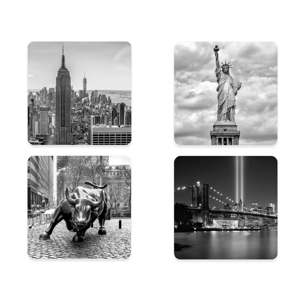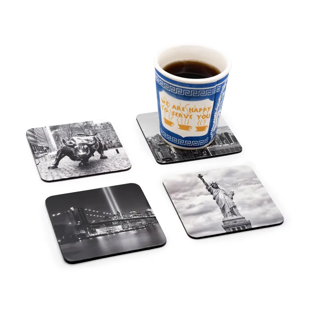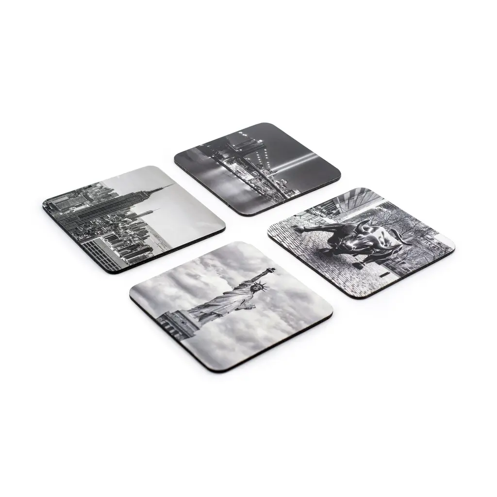 MoMA Exclusive: Proudly display your love for New York City with this set of four coasters featuring black-and-white photographs of its iconic locations by Alejandro Merizalde, known for his work documenting Venice and its surrounding islands in Italy. The NYC Coasters are each 4” square and are laminated with felt bac