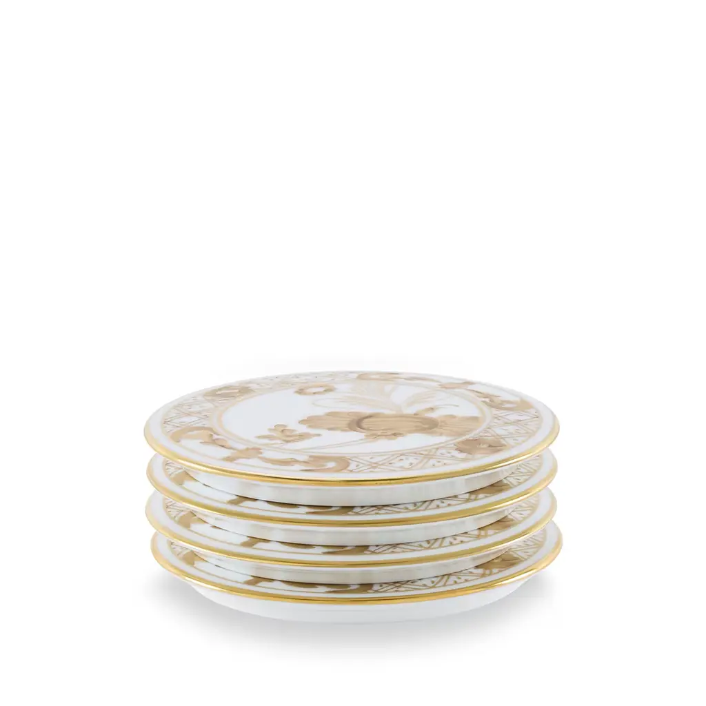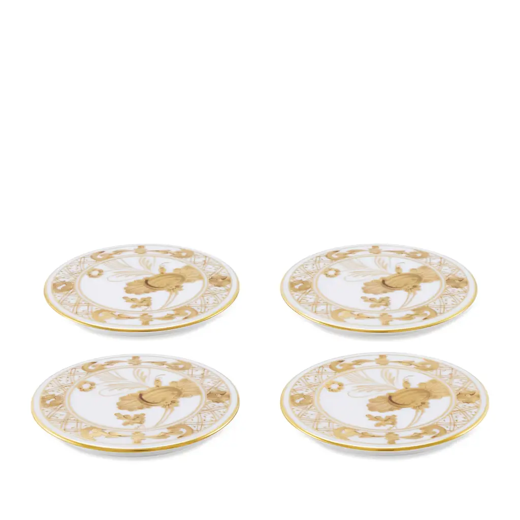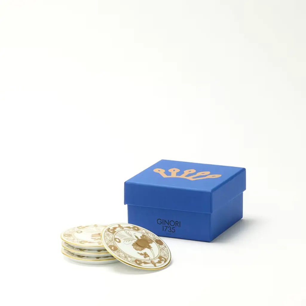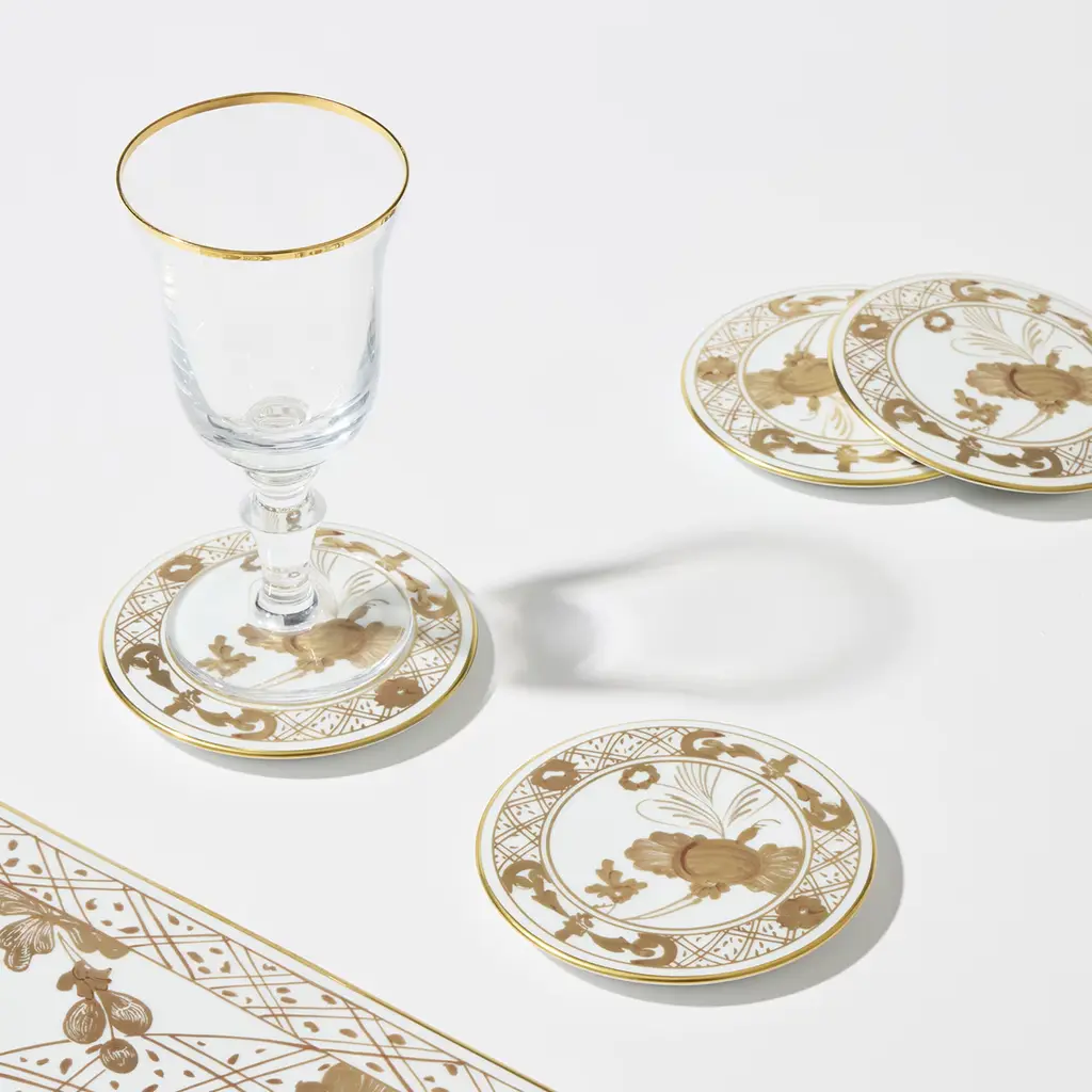 Set of 4 Aurum Decorative Coasters, from the Oriente Italiano Collection. These porcelain coasters, adorned with floral patterns in vibrant hues and gold trim bring elegance and charm to any occasion, making them perfect for everything from outdoor cocktail parties to intimate dinners. The Oriente Italiano collection combines intricate floral designs with vibrant, oriental-inspired colors, transforming each piece into a captivating work of art.