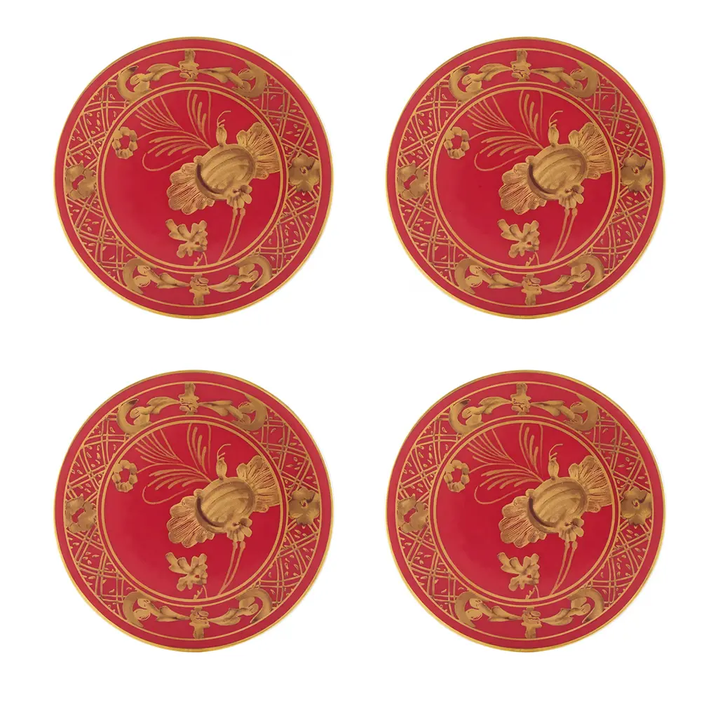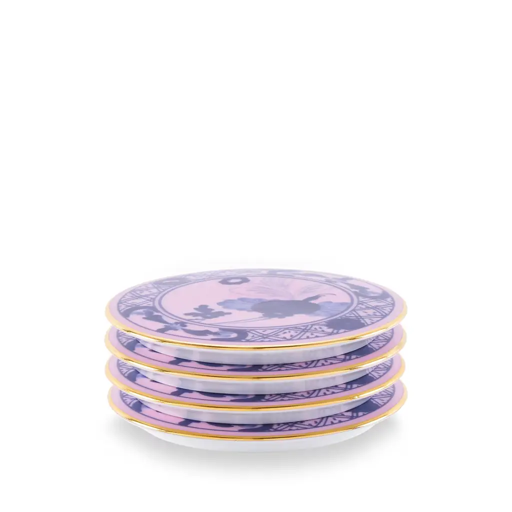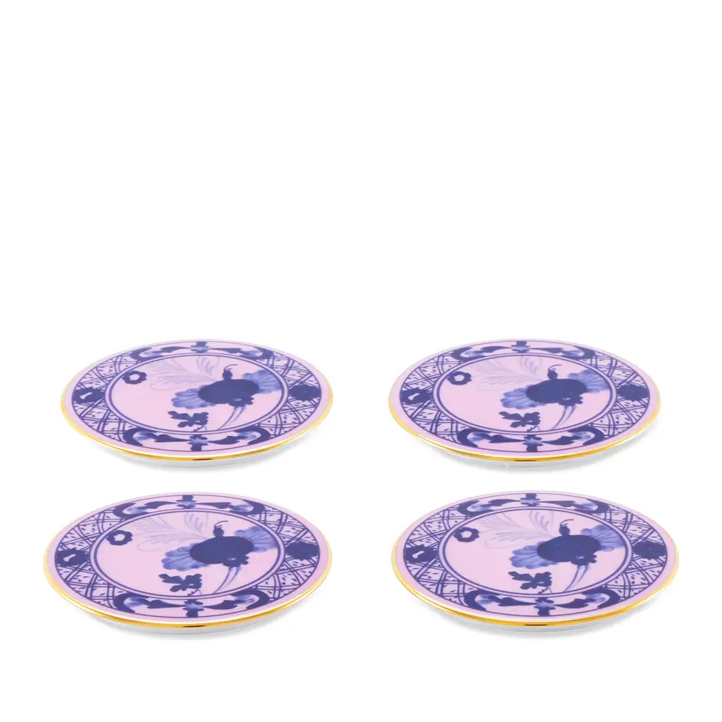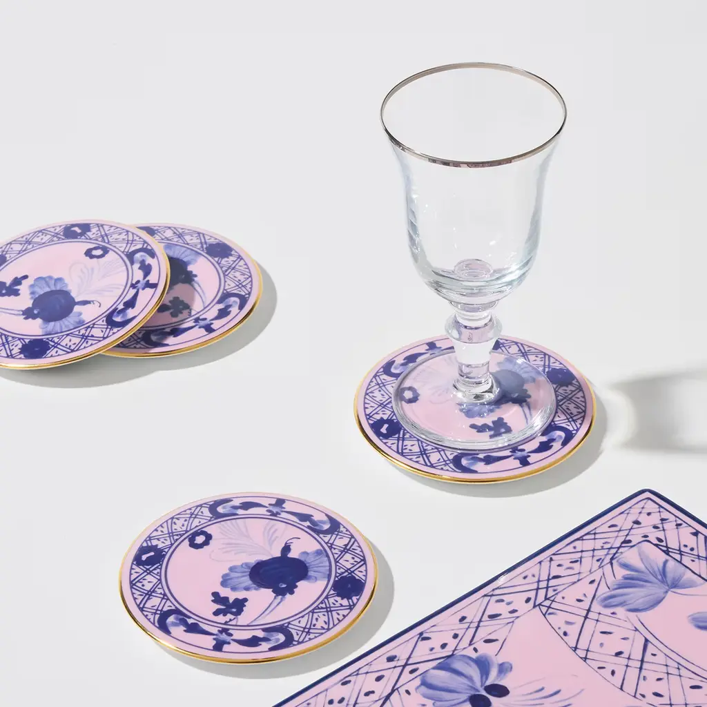 Set of 4 Azalea Porcelain Coasters, from the Oriente Italiano Collection. These four porcelain coasters, featuring vibrant floral patterns. The gold trim highlights the beauty of the Azalea pattern, Perfect for everything from backyard cocktail parties to intimate dinners, these colorful coasters add a distinctive touch to your décor. With its oriental-inspired colors and craftsmanship, each piece in the Oriente Italiano collection is a true work of art.
