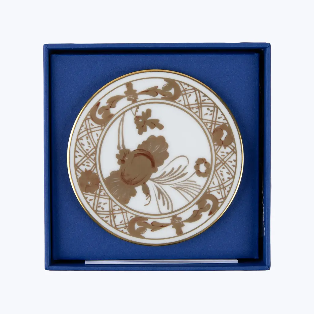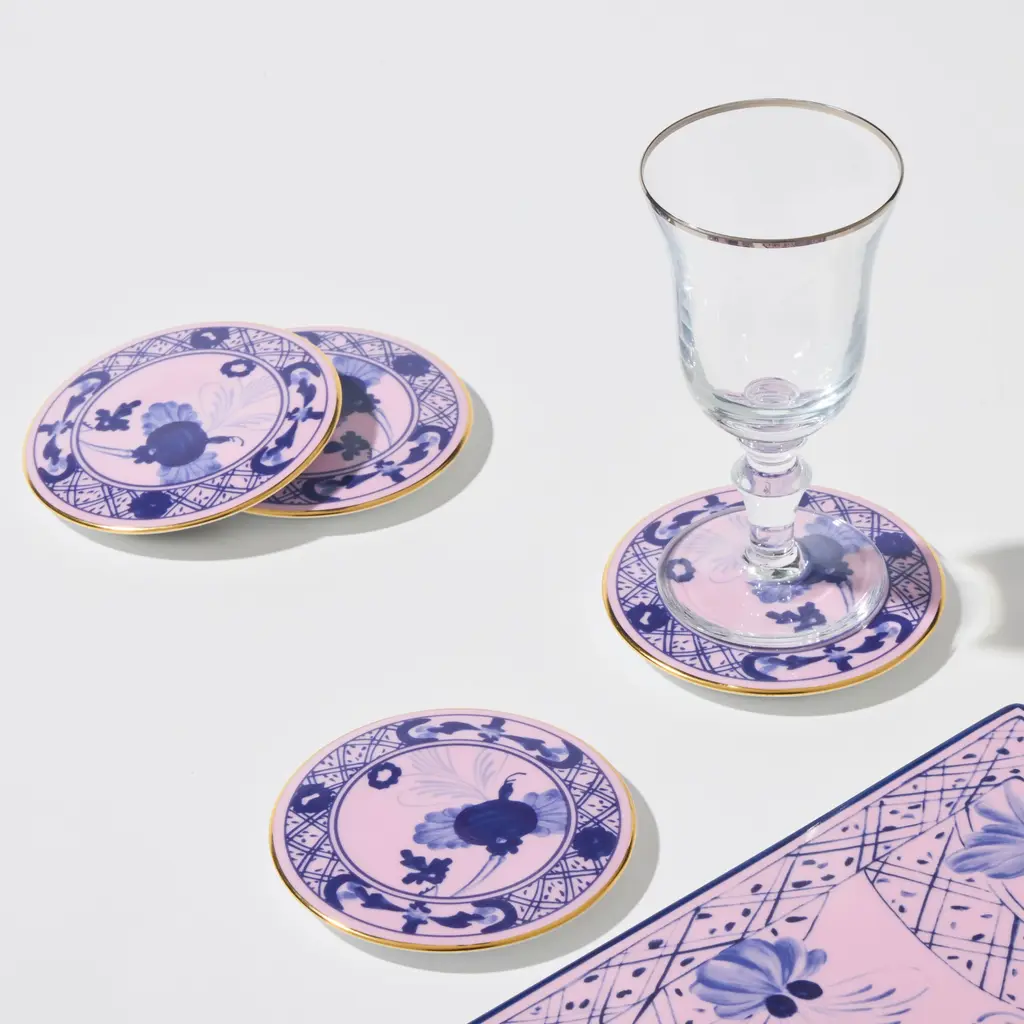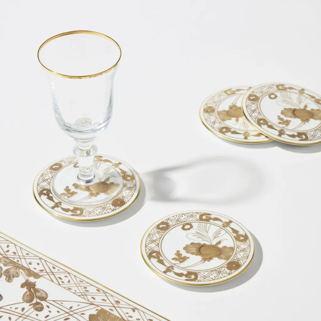The Oriente Italiano Coasters, Set of 4 by Ginori 1735 marries Italian opulence with ancient Asian motifs. Crafted in fine porcelain, this beautiful set of four coasters boasts a stunning ornate pattern accentuated by hand-painted gold trim. An exquisite addition to any table. Made in Italy. Available in shades of Aurum, Azalea, and Iris.