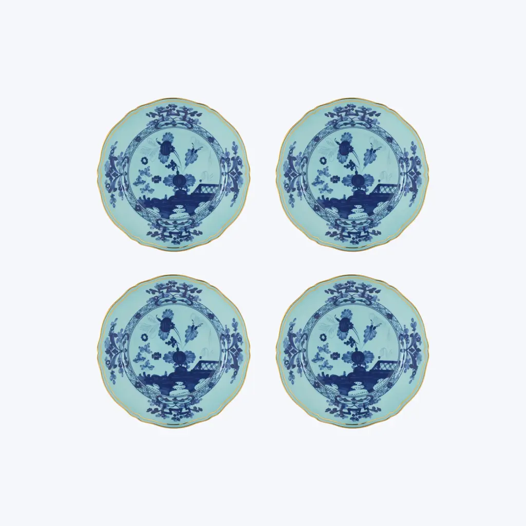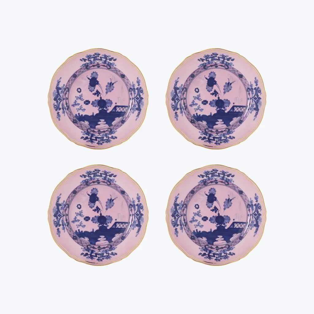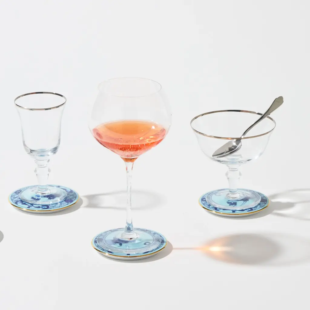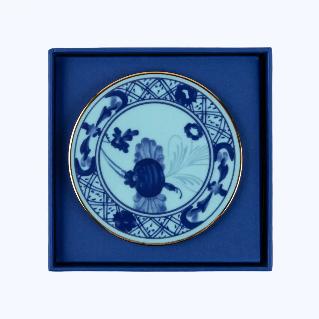 The Oriente Italiano Coasters, Set of 4 by Ginori 1735 marries Italian opulence with ancient Asian motifs. Crafted in fine porcelain, this beautiful set of four coasters boasts a stunning ornate pattern accentuated by hand-painted gold trim. An exquisite addition to any table. Made in Italy. Available in shades of Aurum, Azalea, and Iris.