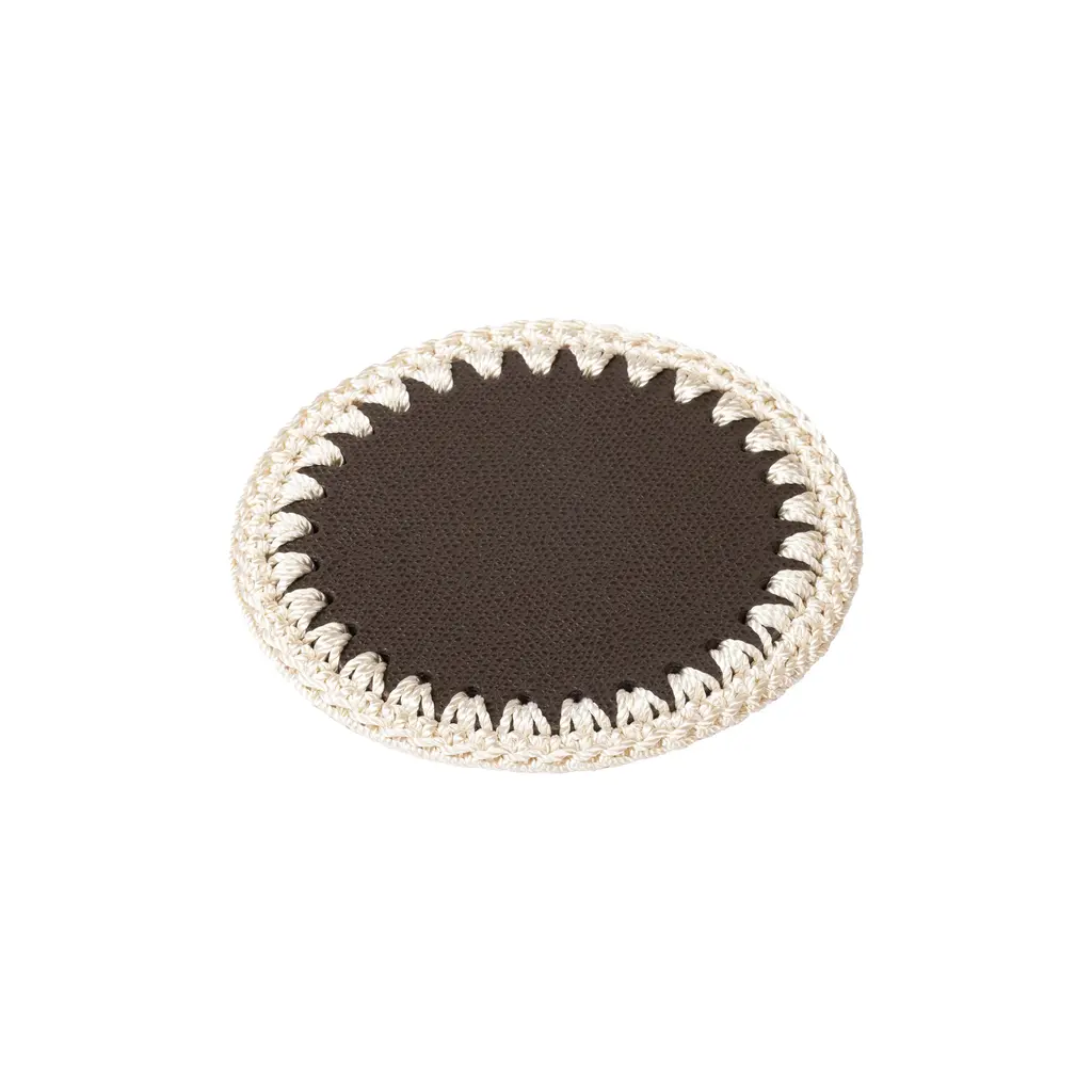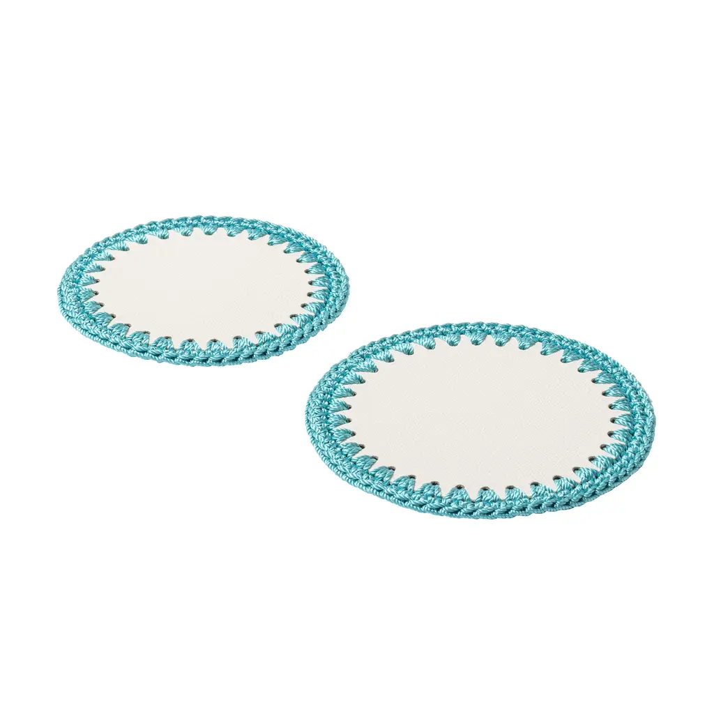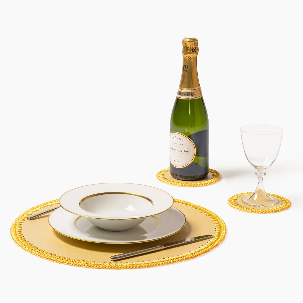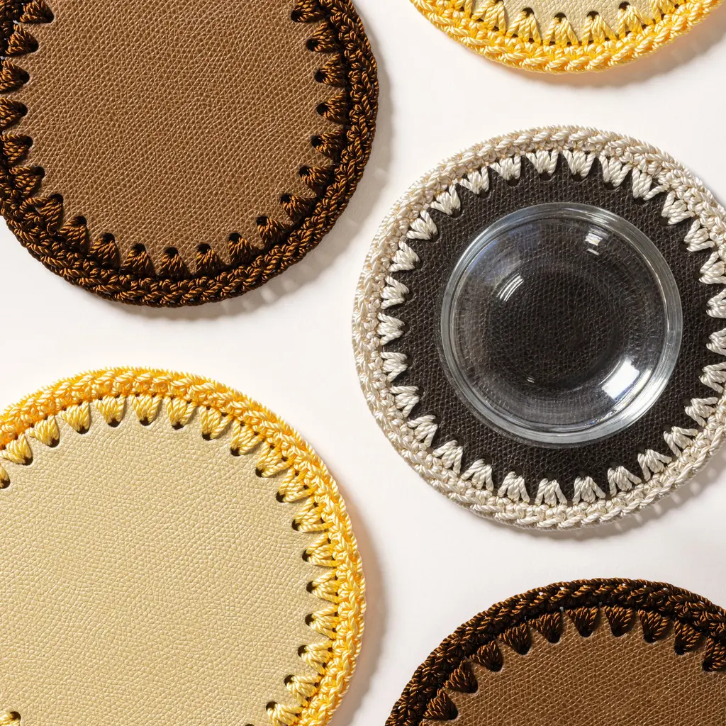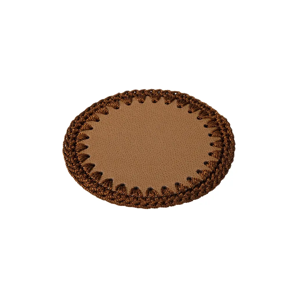 A masterful blend of smooth leather and artisanal weaving, the Rochelle Coaster is a sophisticated design from the Giobagnara and Pigment France collaboration. Expertly handcrafted in Italy, each piece features a fine leather center framed by a refined, handwoven passementerie edge. This rich combination of textures offers surprising durability, making it ideal for both elegant indoor dining and stylish alfresco meals. It's a testament to the art of sophisticated, year-round entertaining. Highlights: