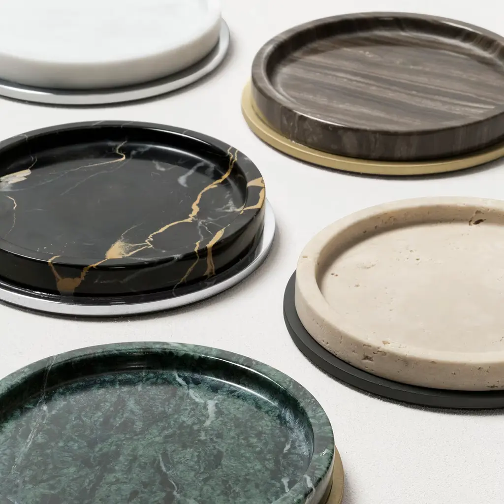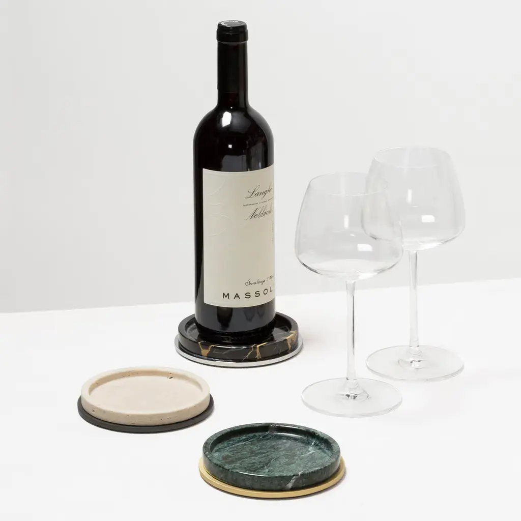 Marble structure featuring a metal base frame. Non-slip waterproof rubber base underneath. The Positano marble bottle coaster boasts metal details available in three different finishes -brushed bronze, brushed brass and polished chrome. Marble finishes available: arabescato white / green guatemala / bramosa brown / black portoro / travertino.