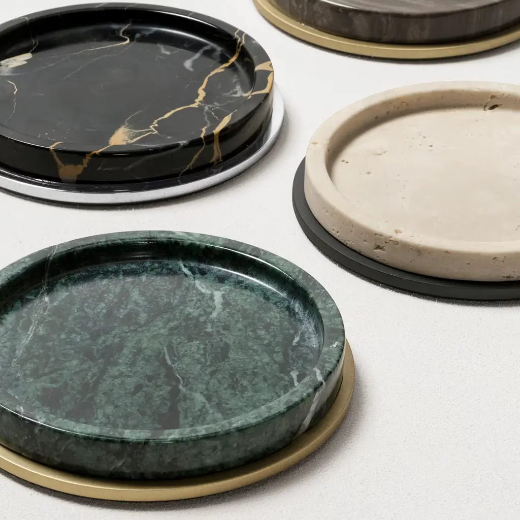 Marble structure featuring a metal base frame. Non-slip waterproof rubber base underneath. The Positano marble bottle coaster boasts metal details available in three different finishes -brushed bronze, brushed brass and polished chrome. Marble finishes available: arabescato white / green guatemala / bramosa brown / black portoro / travertino.
