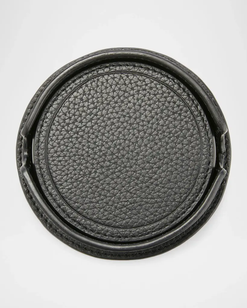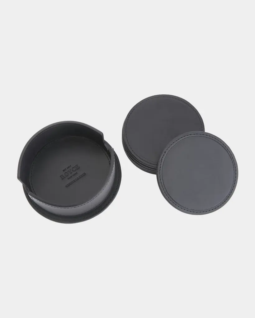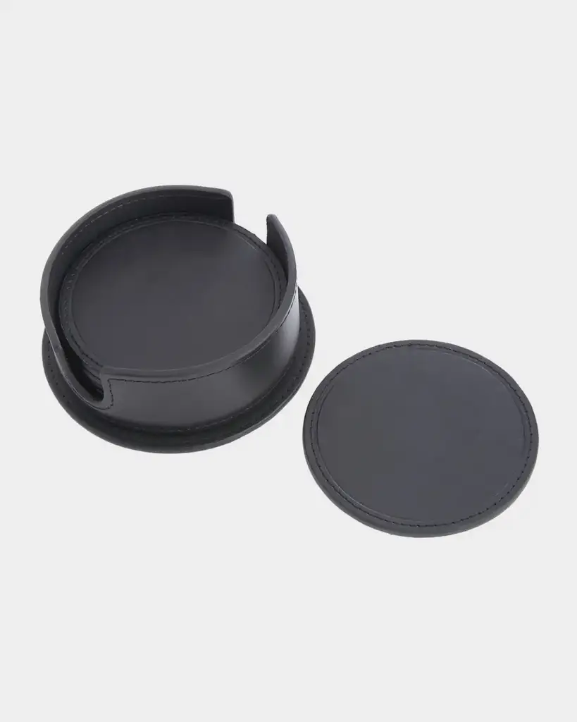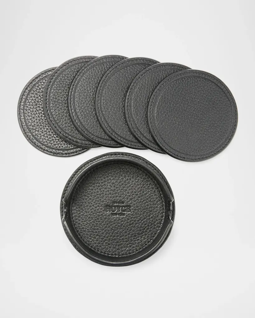Perfect gift for home or office. Six round genuine leather coasters, with non-skid backing stacked inside a matching leather holder. Each individual coaster is 3" round. Handmade construction. Complimentary monogramming in style shown. Imported. Please Note: Please order carefully. Orders for personalized items cannot be canceled, and personalized items cannot be returned. undefined