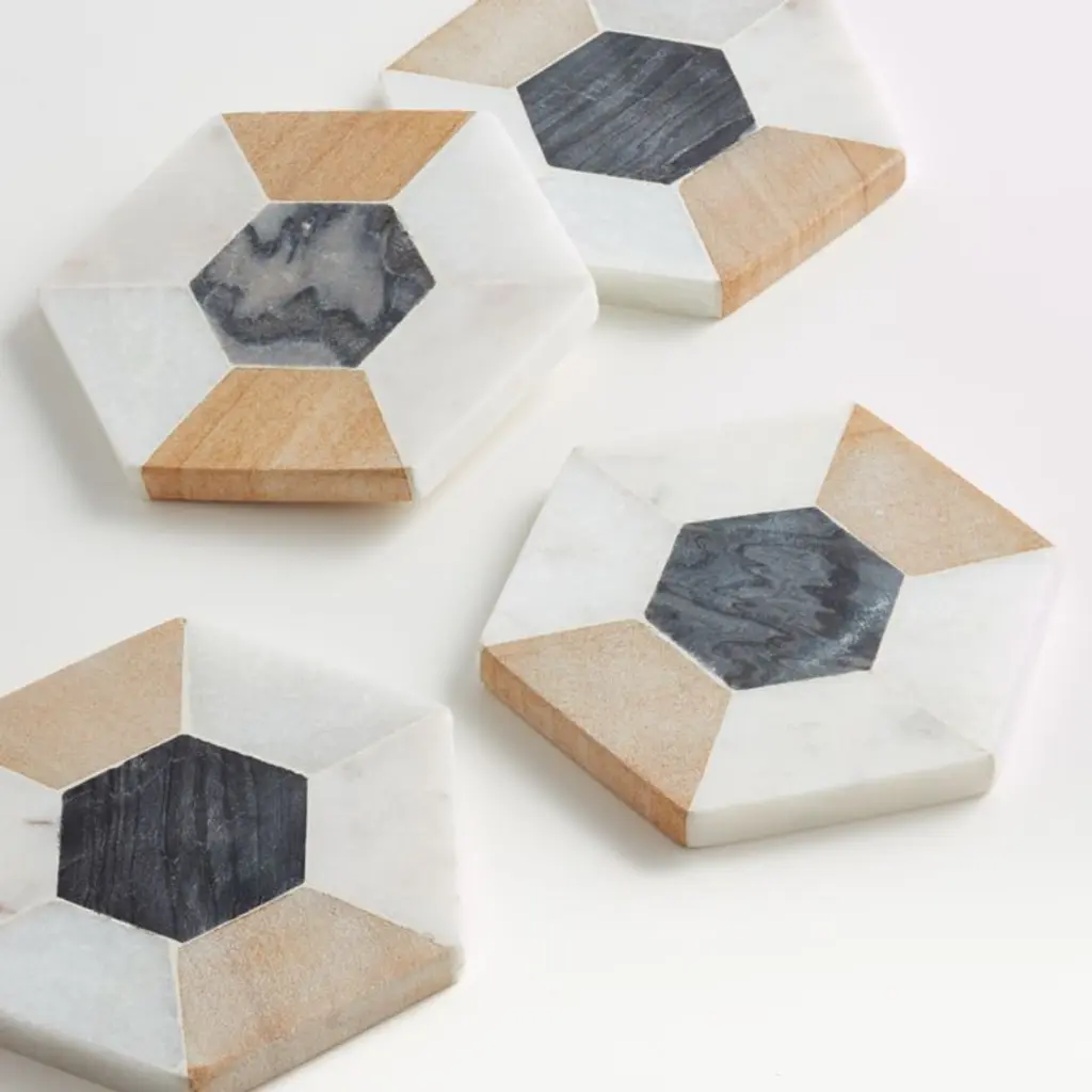 Terrazzo Coasters Set of Four. Crafted from eco-resin and concrete with marble inlay, these coasters are Fair Trade Certified and handcrafted in India. Measuring 4" W. x 4" L. x 0.39" H., they offer a stylish and sustainable addition to any home.