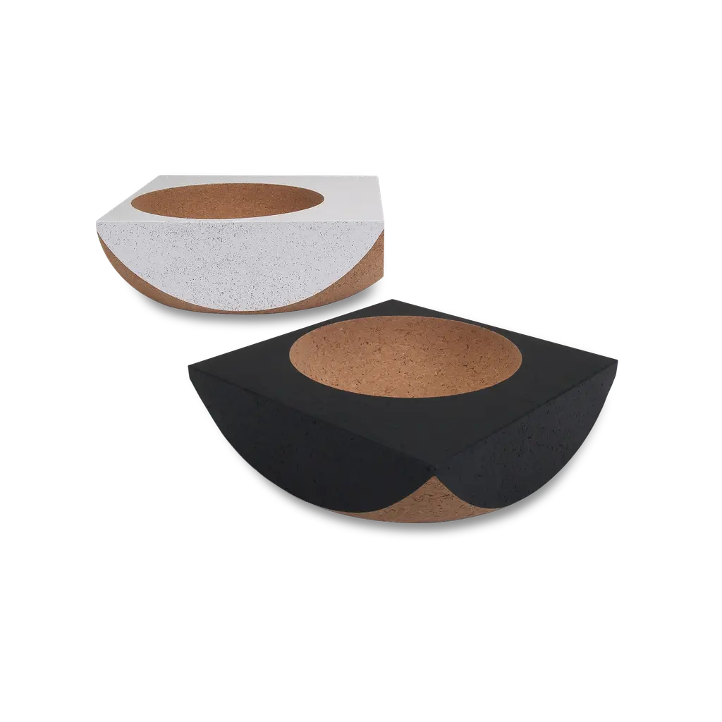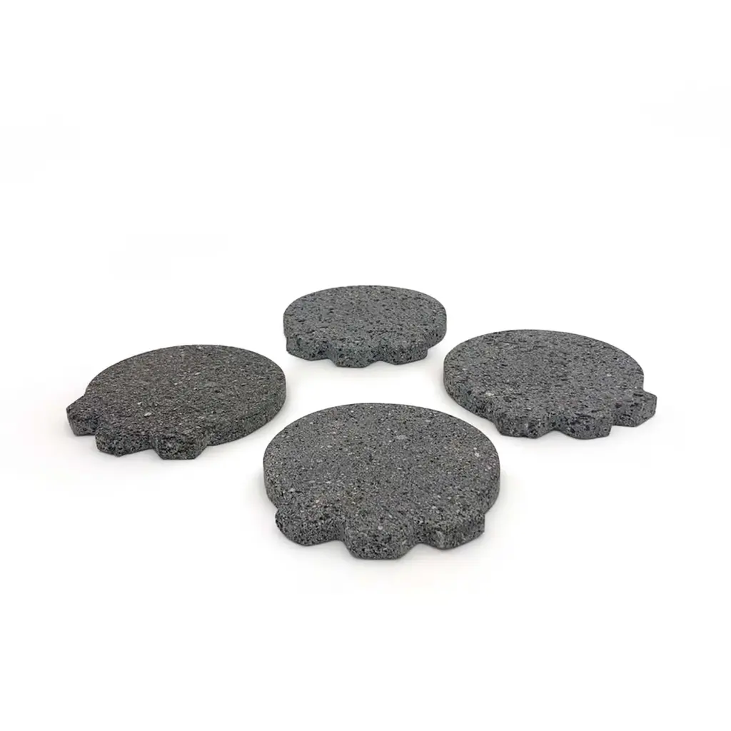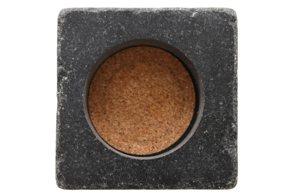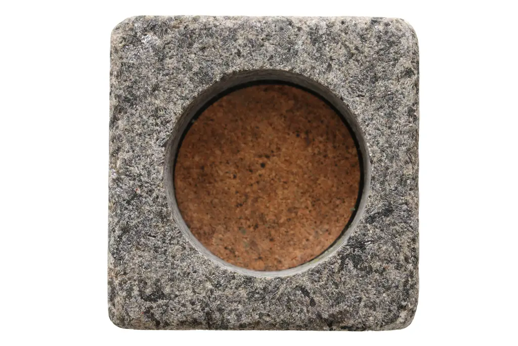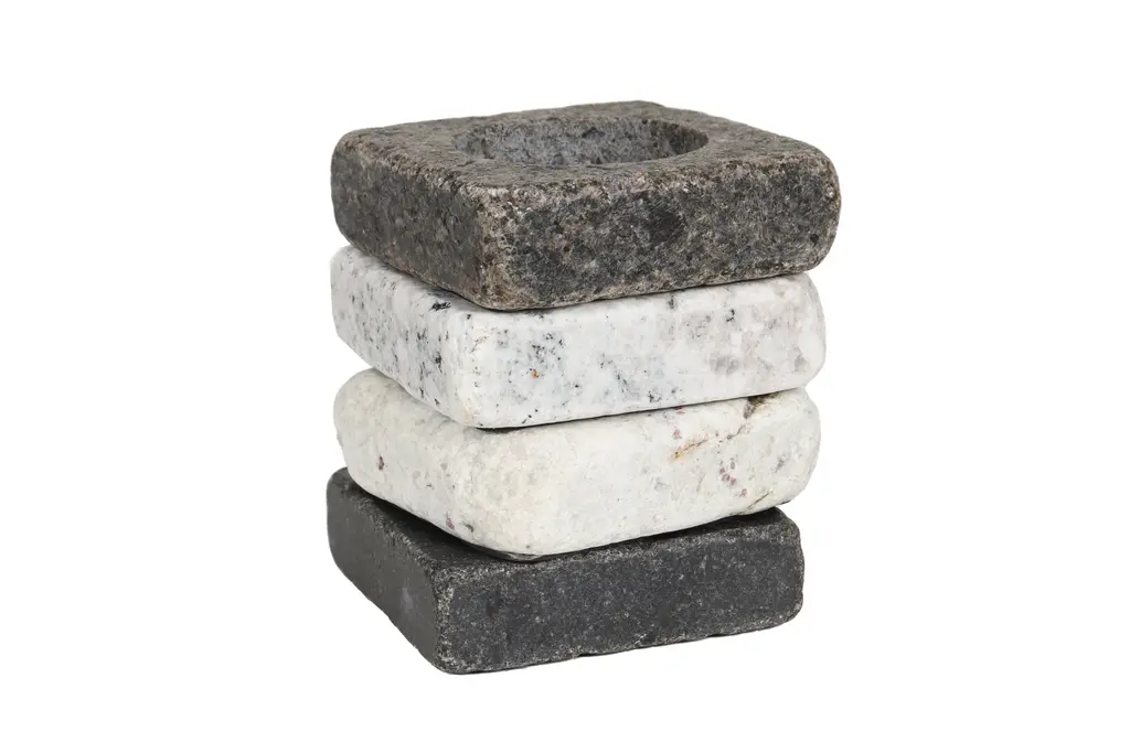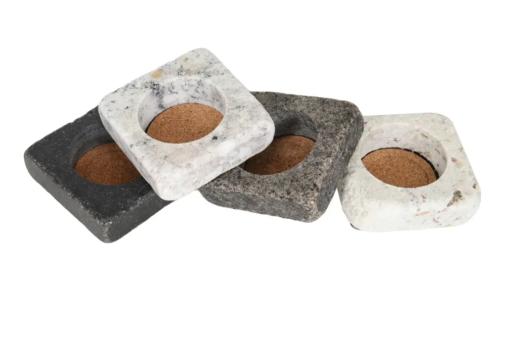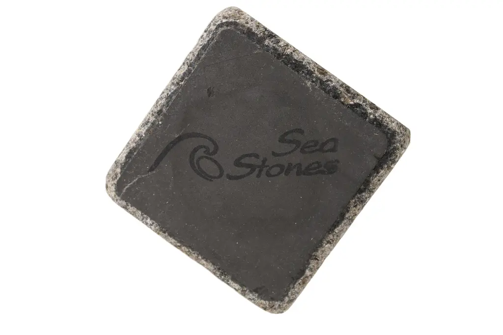 A set of four coastal style sea stone coasters. Thick square sea stones in white, gray and black have rounded corners and deep round holes to support cups and flasks. Finished on the bottom with a cork and rubber base. Each is marked “Sea Stones” underneath. Dimensions per coaster.